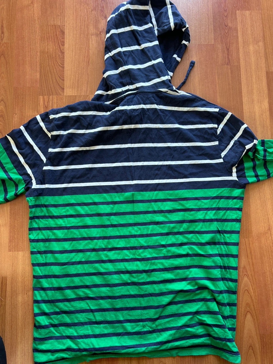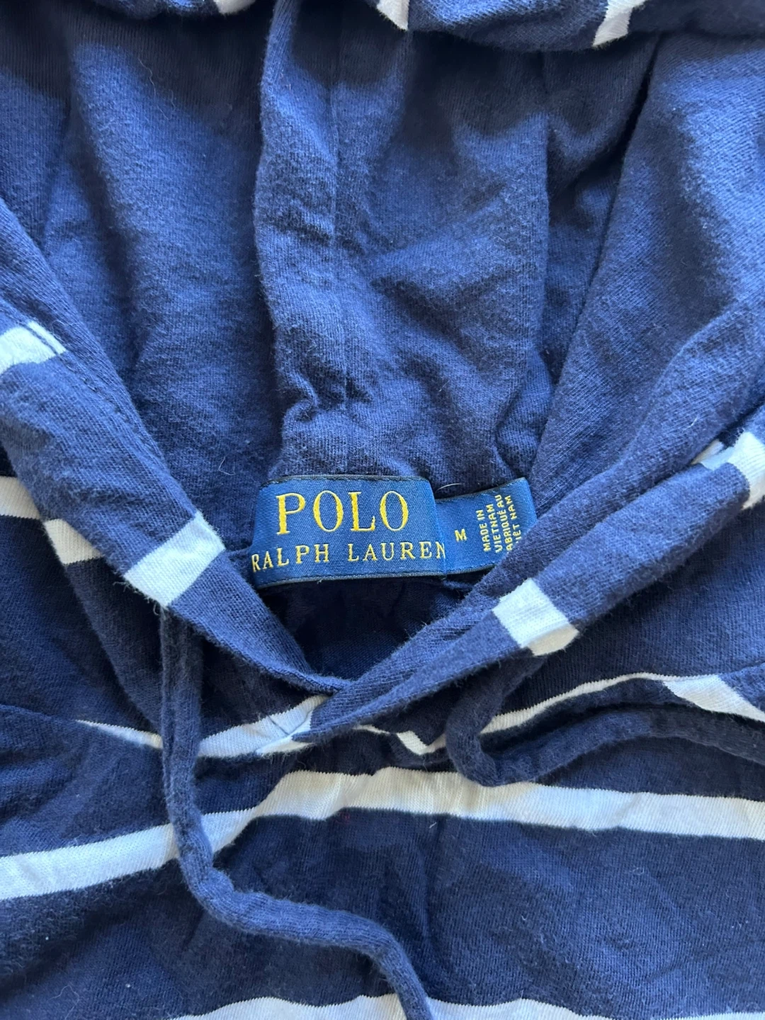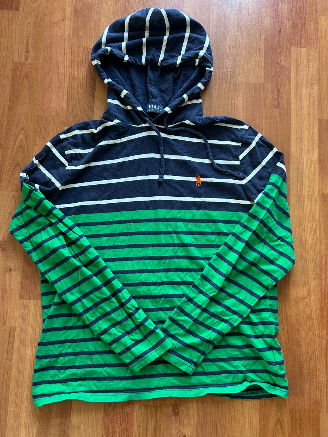 Selling a men’s Polo Ralph Lauren light hoodie with a cool striped design! It's a size medium and features a mix of navy, white, and green stripes. The hoodie has a comfortable fit and is perfect for casual wear