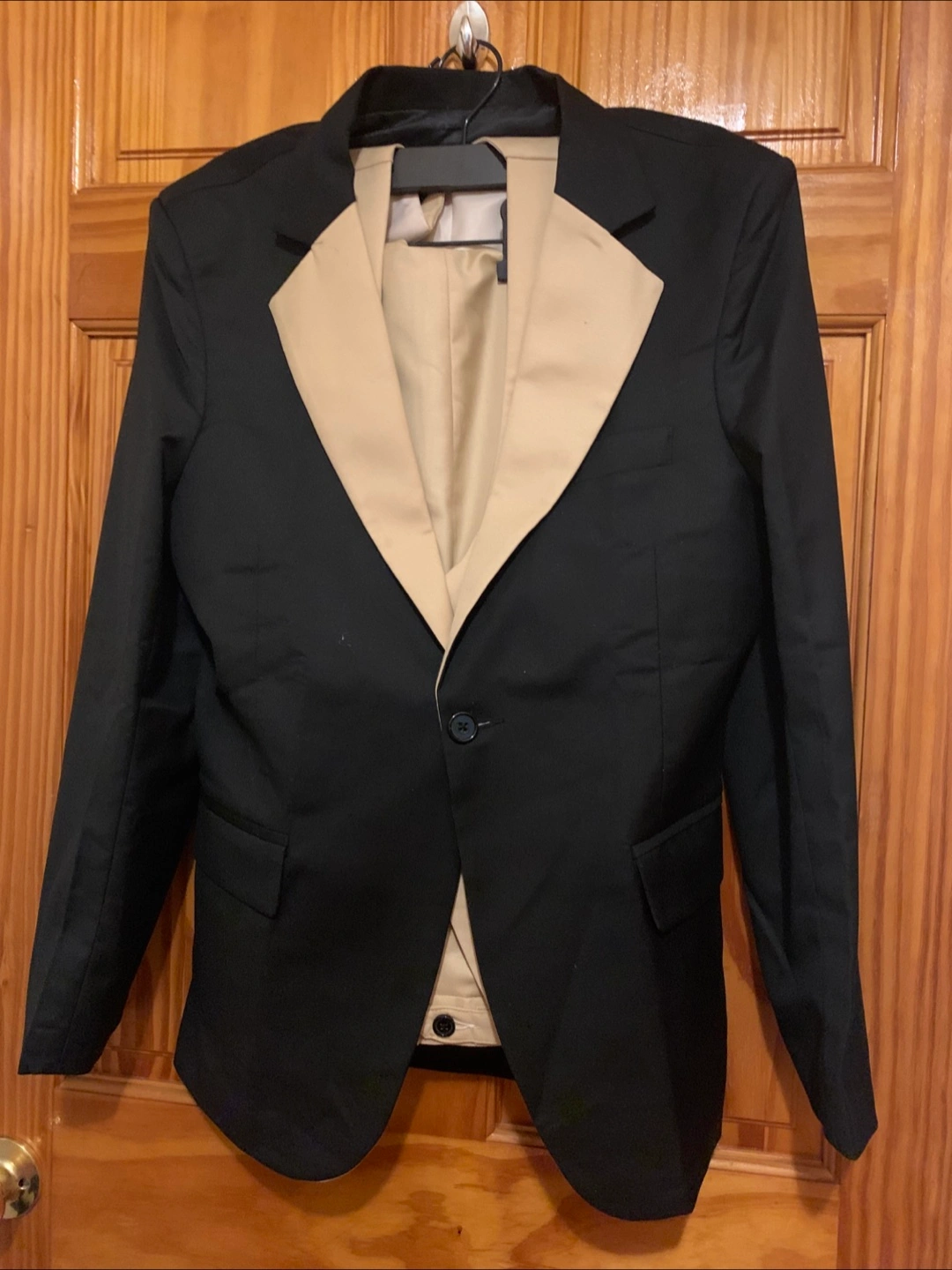 Selling a men's suit that includes a jacket, vest, and pants. The jacket is black with a tan lapel, and the vest and pants are a matching tan color. Great for formal events or special occasions! 3pcs never used.