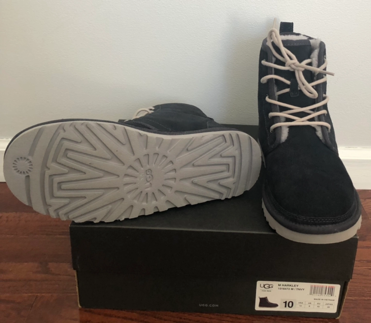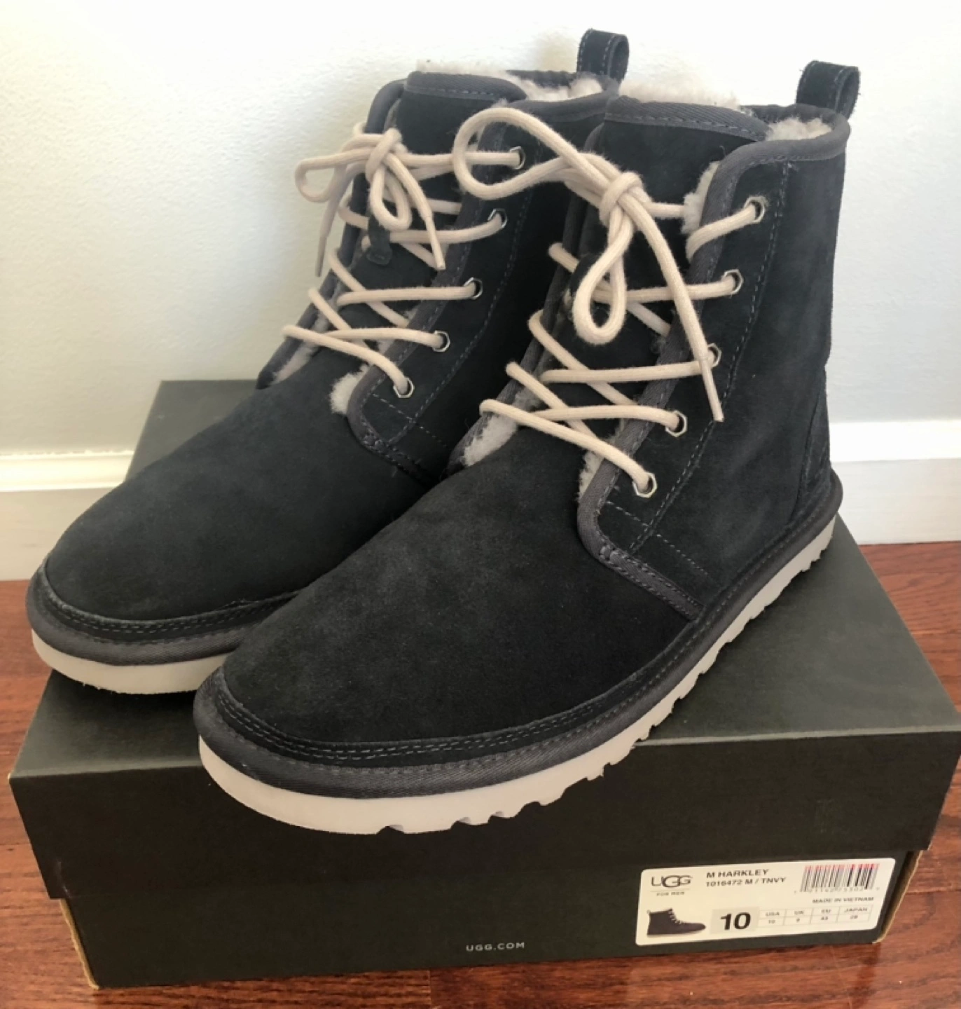 10Navy suede boots with grey soles and laces. Fur lined. Comes with original box.