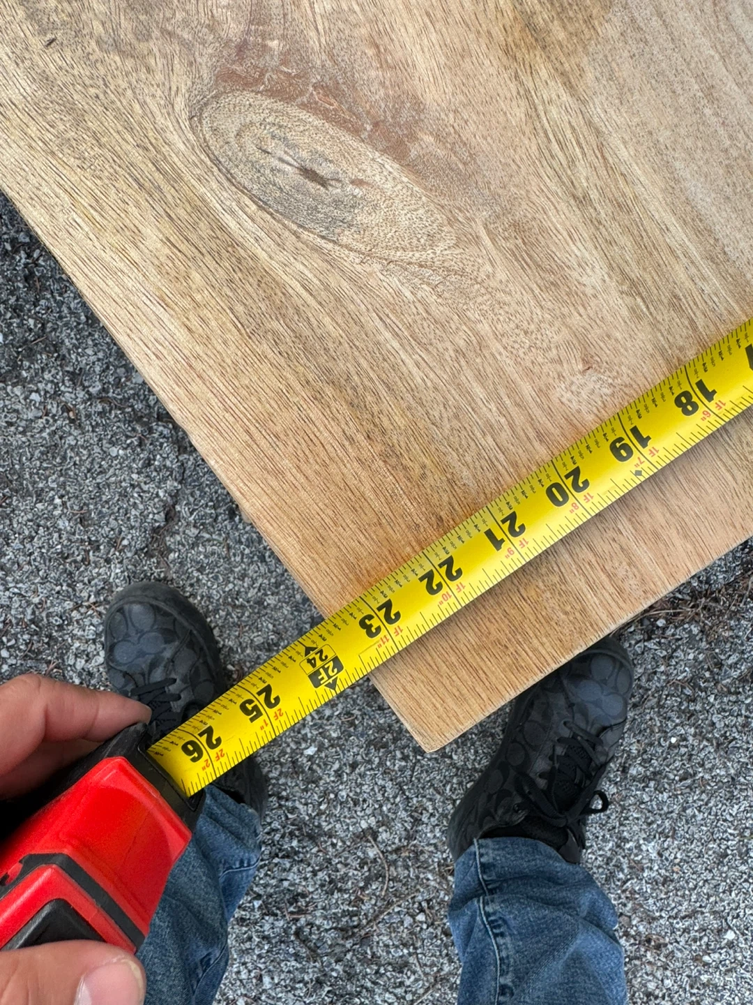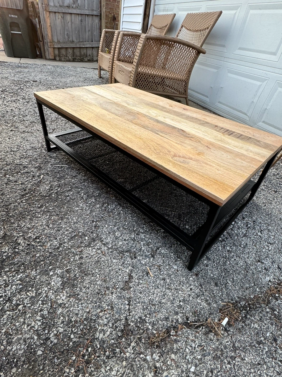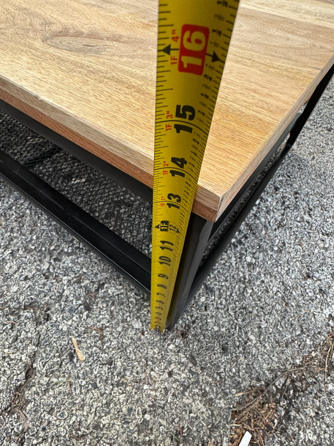 This coffee table features a natural wood top with a rustic grain pattern. It's supported by a sturdy black metal frame and includes a lower shelf with a mesh design. Tabletop is approximately 47 inches long and 15 inches wide. The height is about 16 inches.