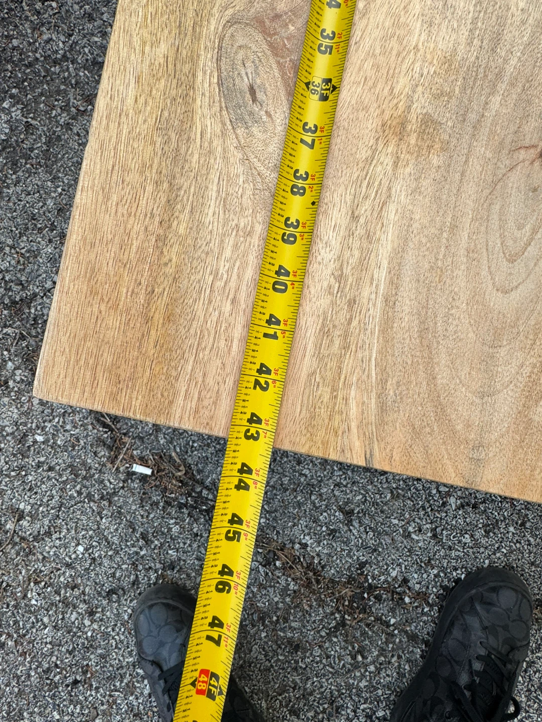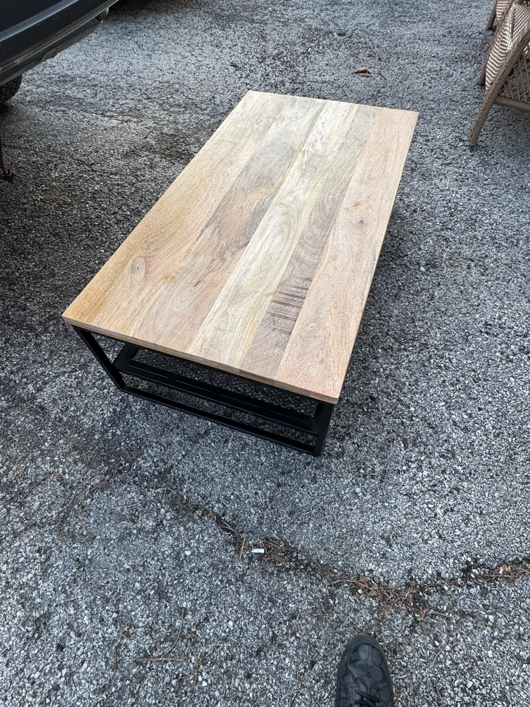 This coffee table features a natural wood top with a rustic grain pattern. It's supported by a sturdy black metal frame and includes a lower shelf with a mesh design. Tabletop is approximately 47 inches long and 15 inches wide. The height is about 16 inches.