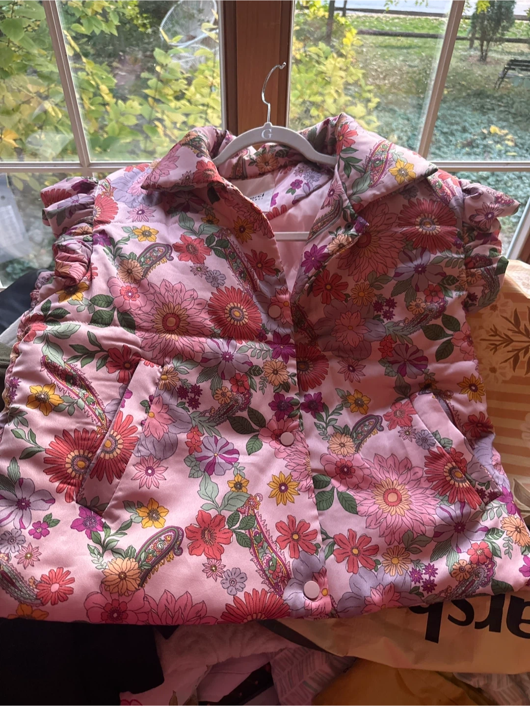5This is a floral padded vest from &merci. It features a beautiful floral pattern in shades of pink, orange, yellow, and purple. It's perfect for adding a touch of whimsy to any outfit!