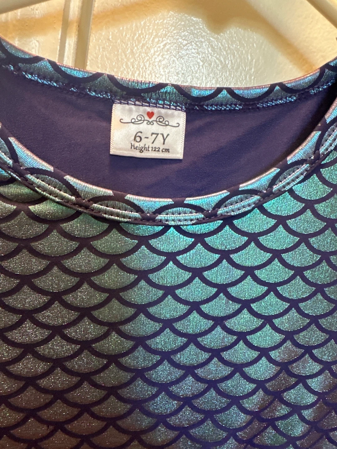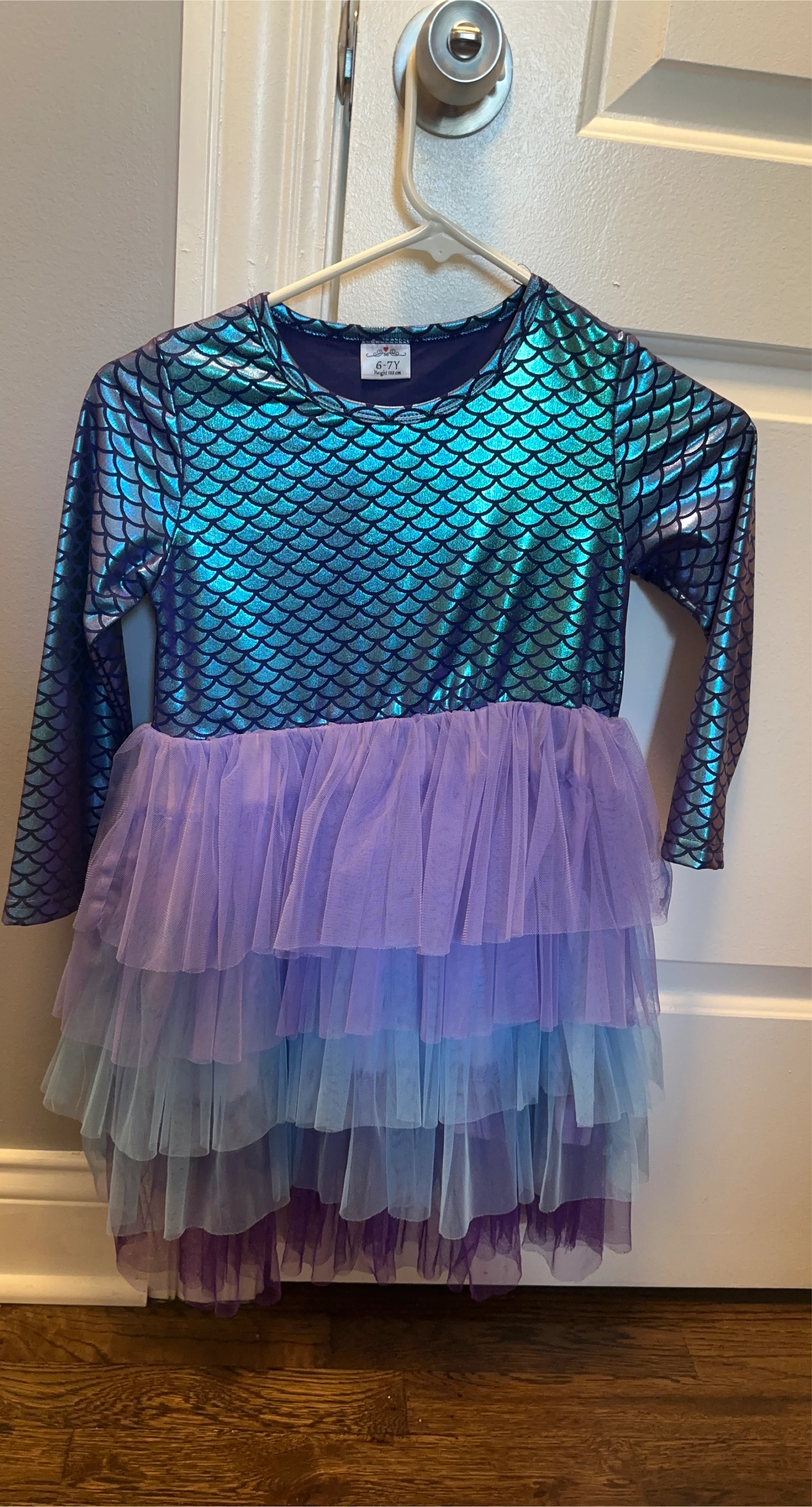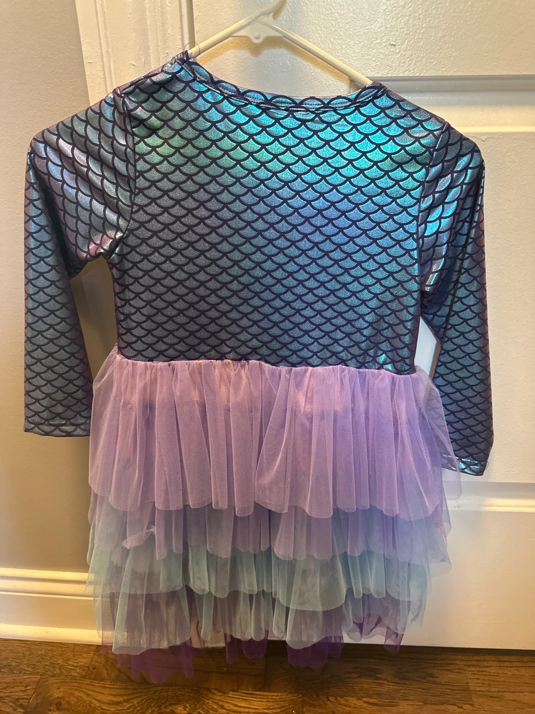 Cute mermaid scale dress for a child aged 6-7 years! The top features a shiny, iridescent scale pattern, and the skirt has layers of tulle in shades of purple and blue. Perfect for dress-up or a special occasion