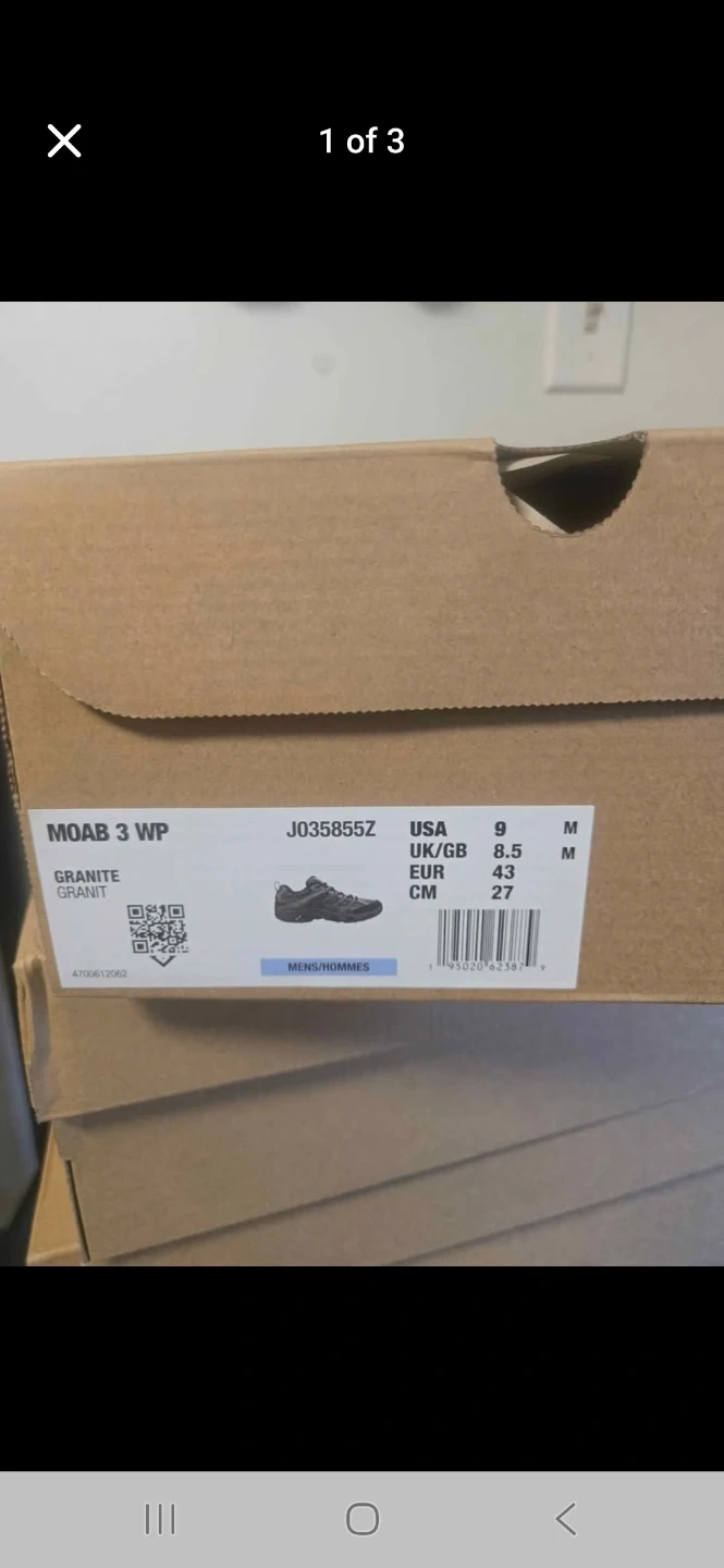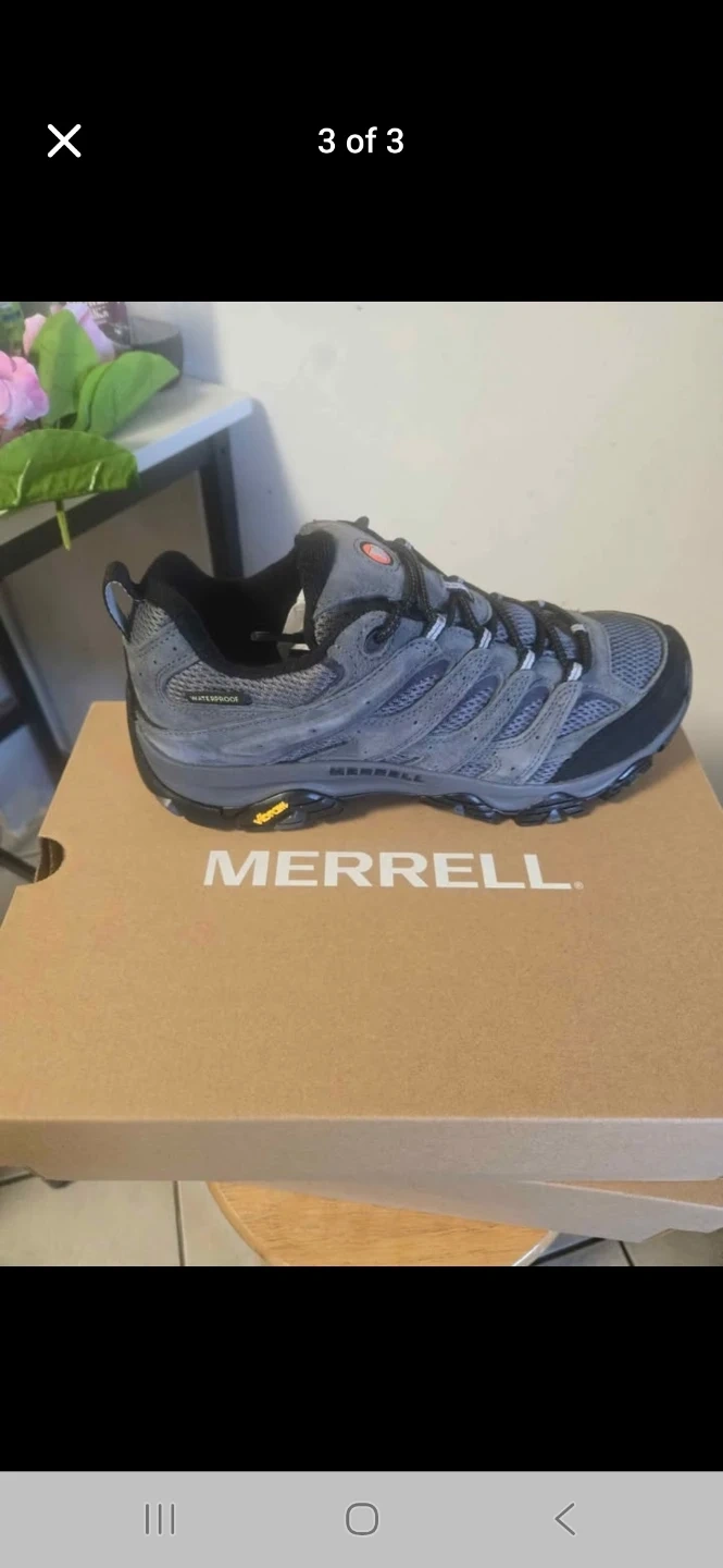 62Selling a pair of Merrell Moab 3 Waterproof shoes in Granite color, men's size 9 (US). These are great for hiking or everyday wear. They are waterproof to keep your feet dry. The box is included!