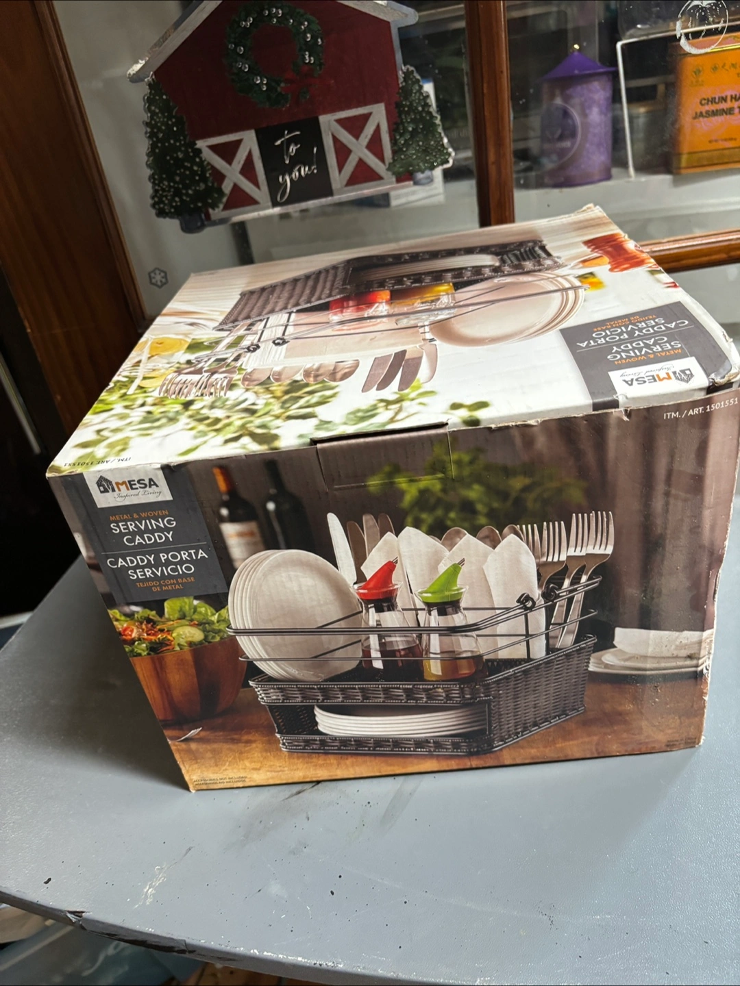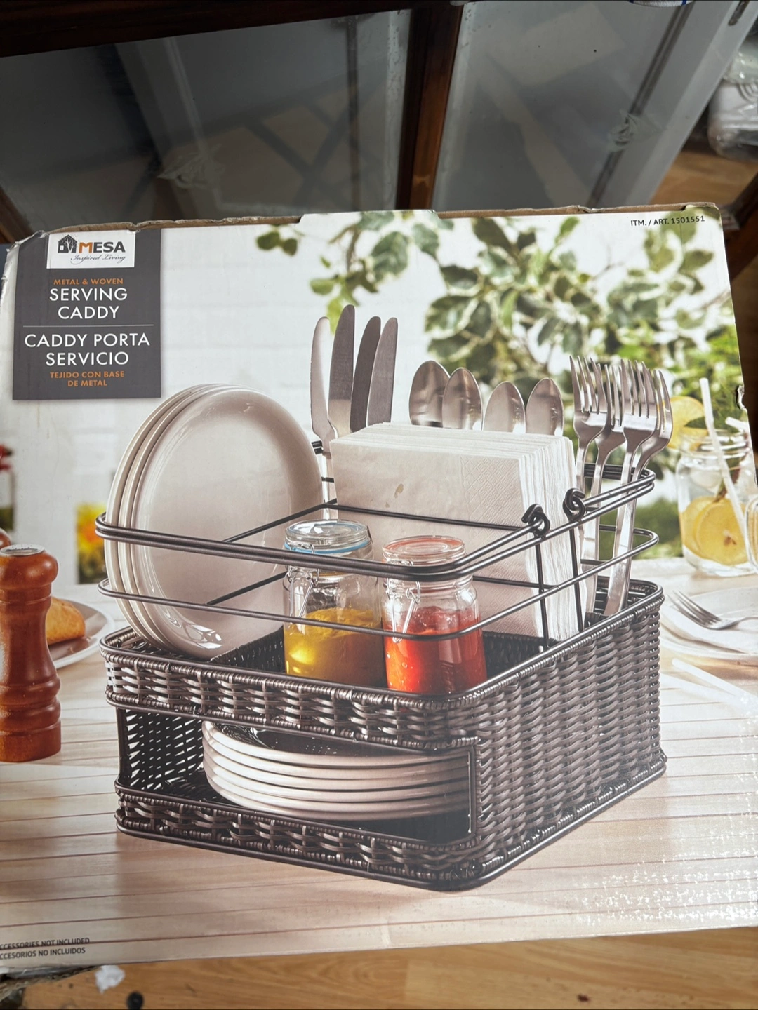 Selling a Mesa serving caddy. It's perfect for organizing your plates, cutlery, and napkins for any gathering. The caddy comes with a base for added stability and convenience. It's a stylish and functional addition to your dining setup