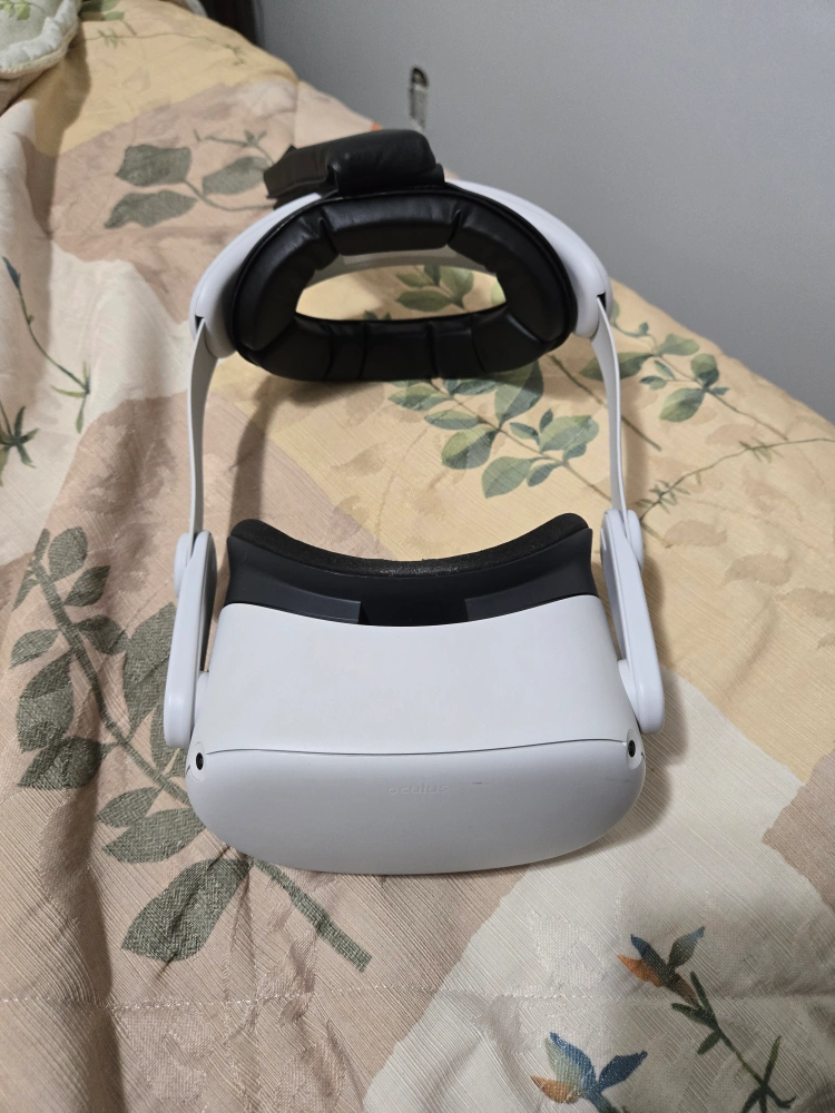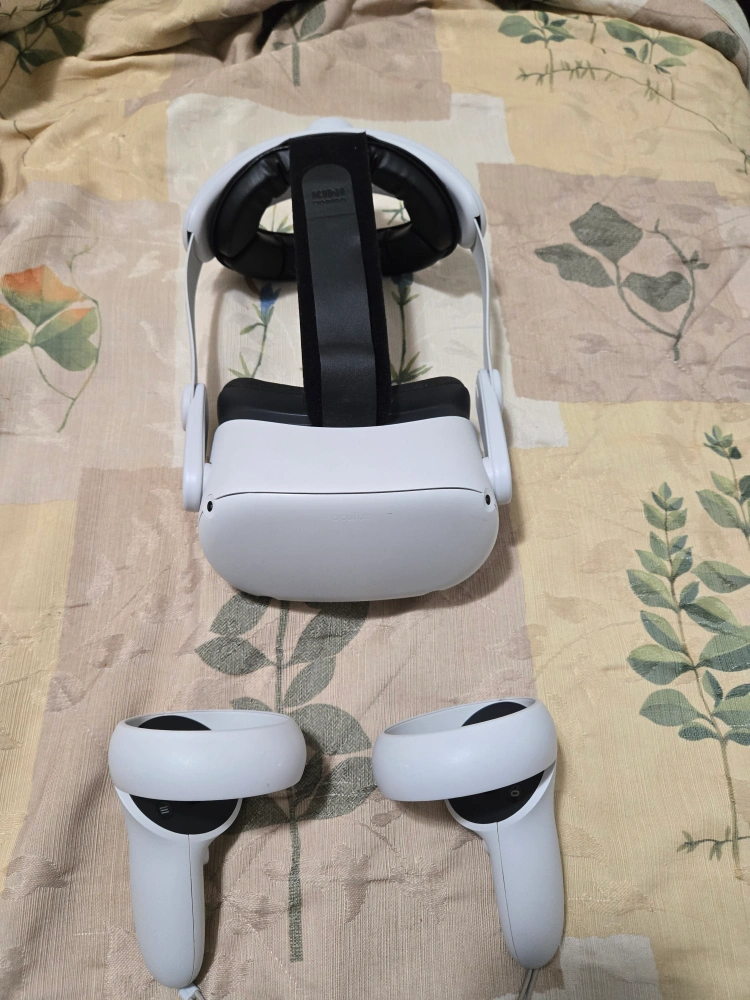10VR headset and 2 controllers. Includes a kiwi head strap. Includes face and glasses cover, and has 256 gb of storage. Does not include charger or original box. Used and still in good condition.