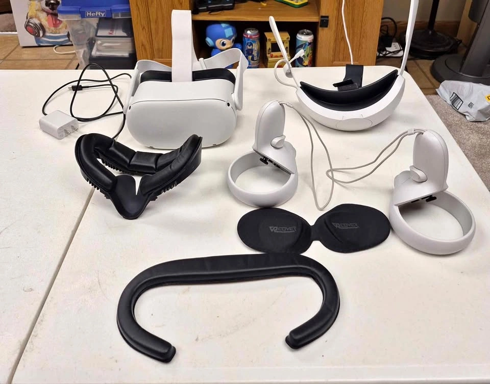 65Selling a 128GB Meta Quest 2 with offical Meta Battery Extender strap and power adapter. I am also including VR Cover with face mount and both cover sizes. The VR head and controllers are in excellent working condition. I had the actual headset and one of the controllers (for got which one) replaced by Meta. I will factory reset the headset before you get it. I don't have either the Meta glasses adapter nor the one for VR Cover. VR Cover need it's own from them. Depends on your glasses the thicker face cover might work. VR Cover face pads are super easy to clean. Just use a clean wipe to clean it. I will also include VR Cover lenses covers. CASH ONLY PAYMENTS!!!