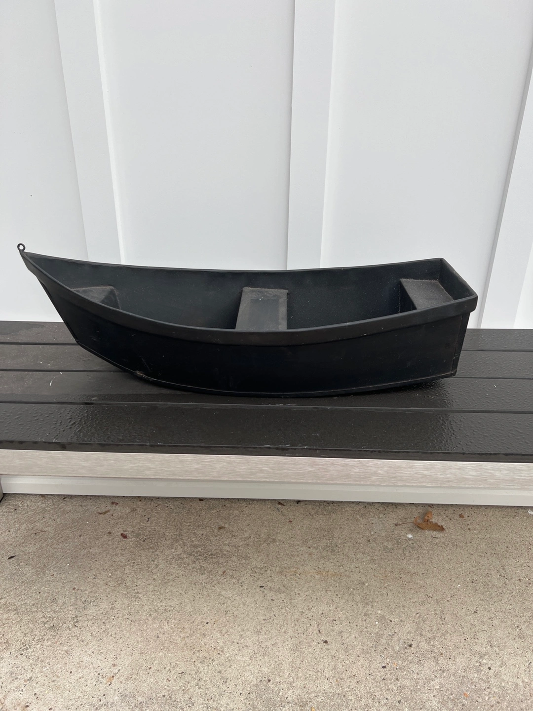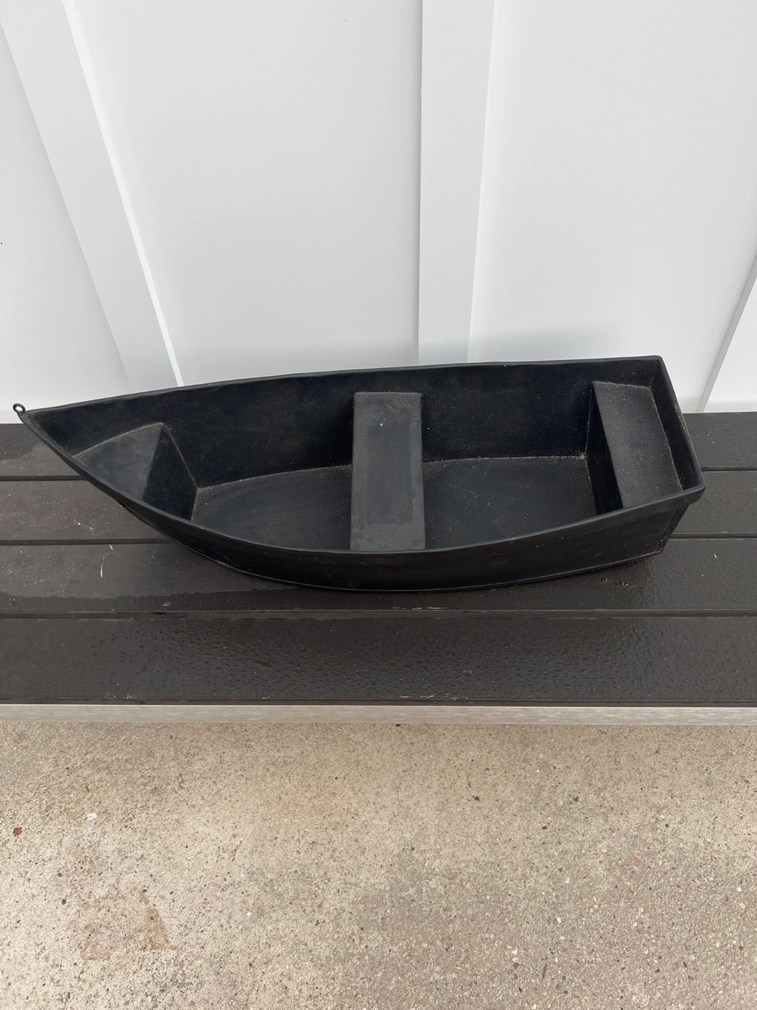 Black metal planter shaped like a boat. Has two compartments for planting.