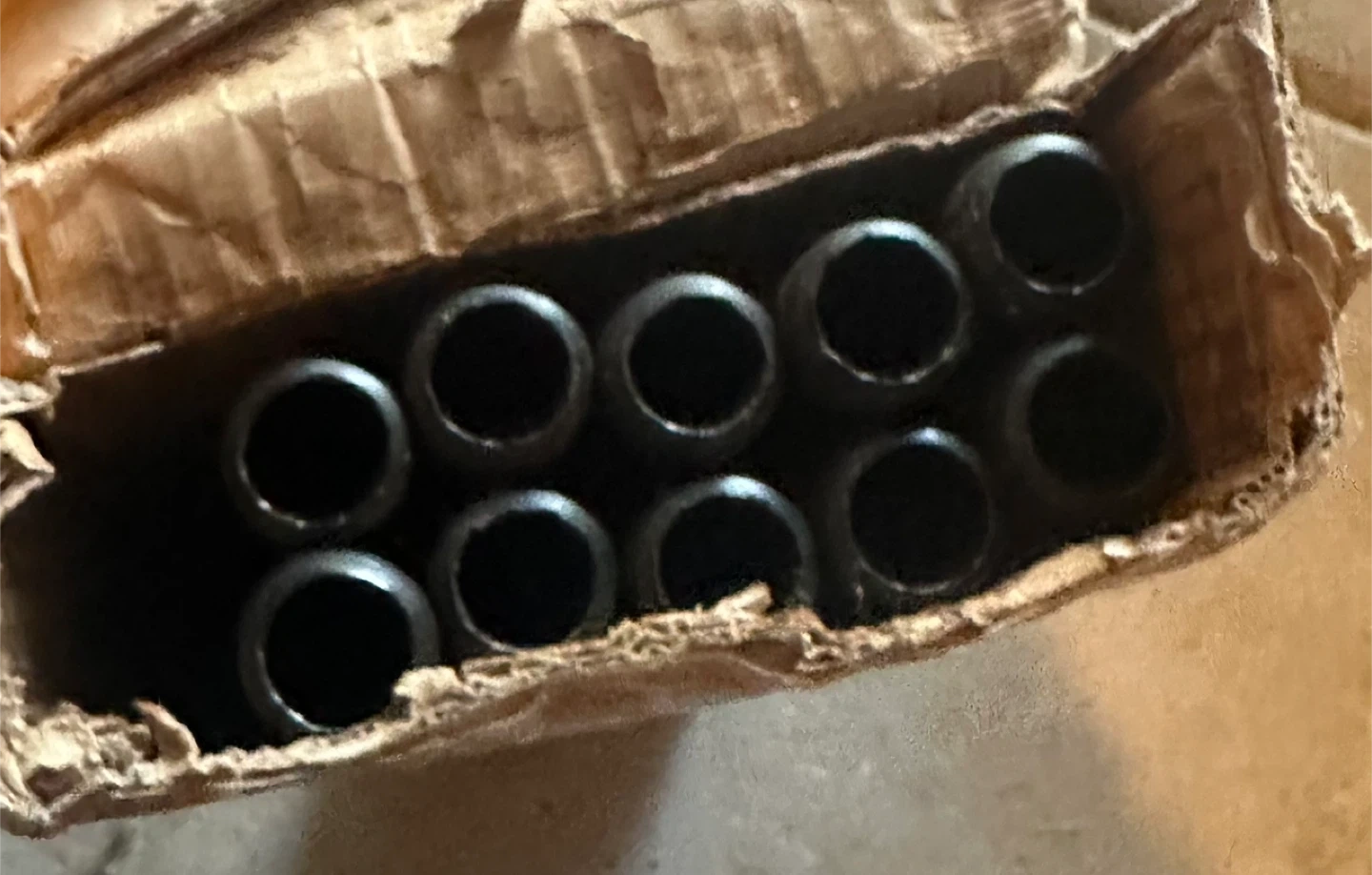 I'm selling a set of metal bushings in a cardboard box. They appear to be in good condition.