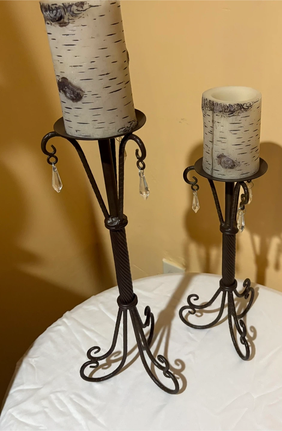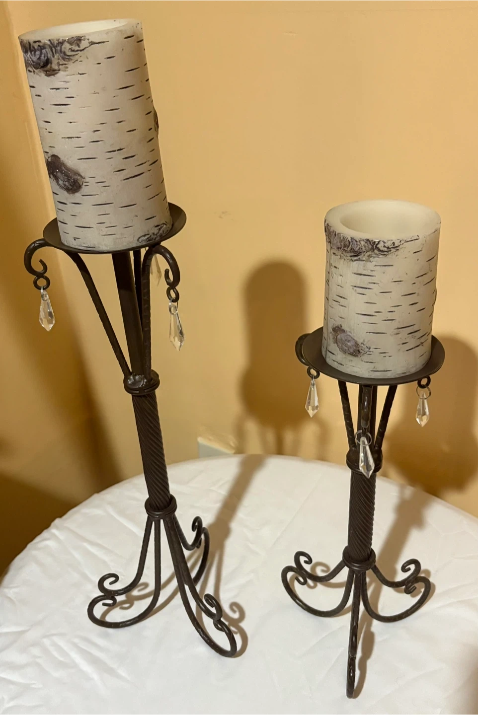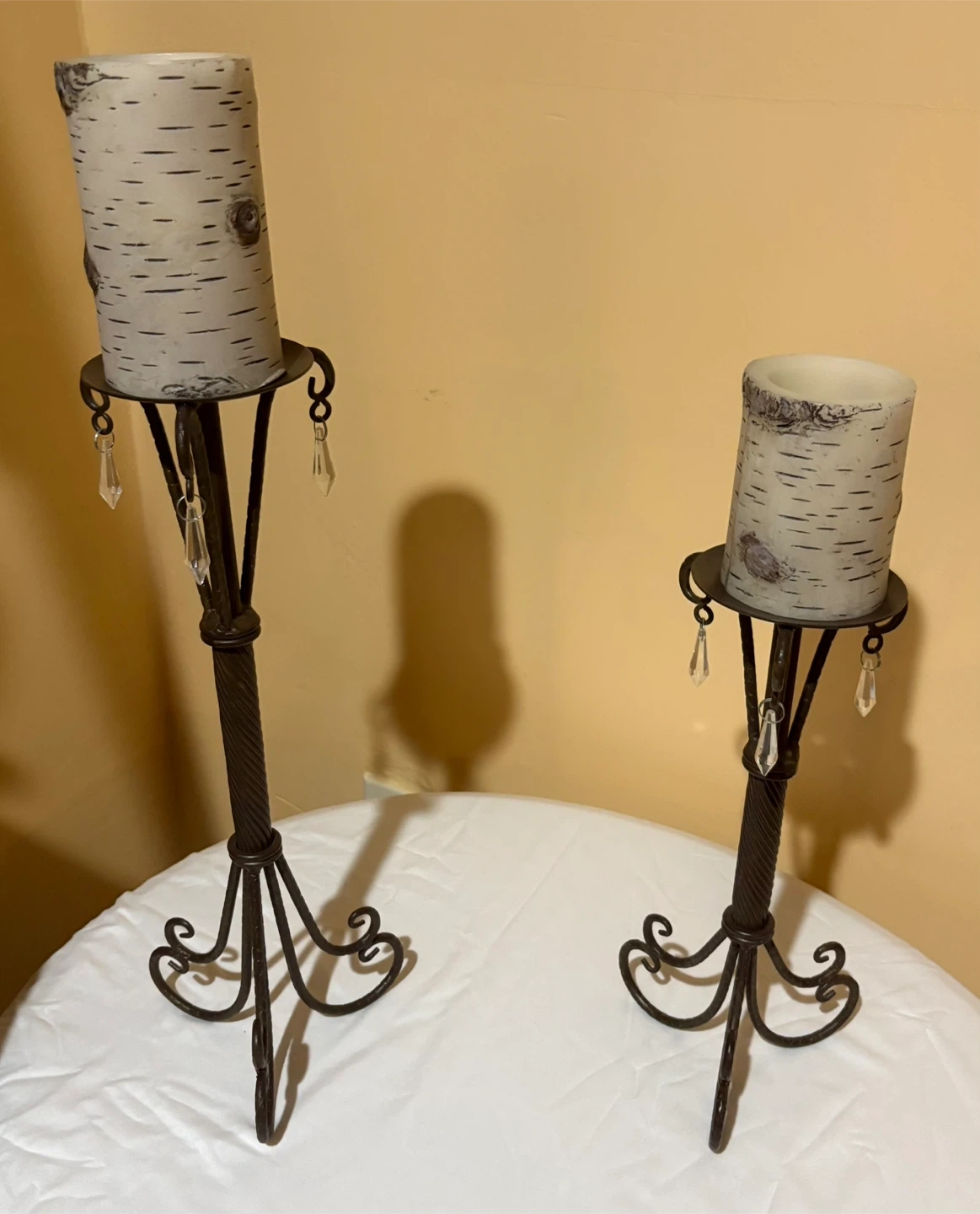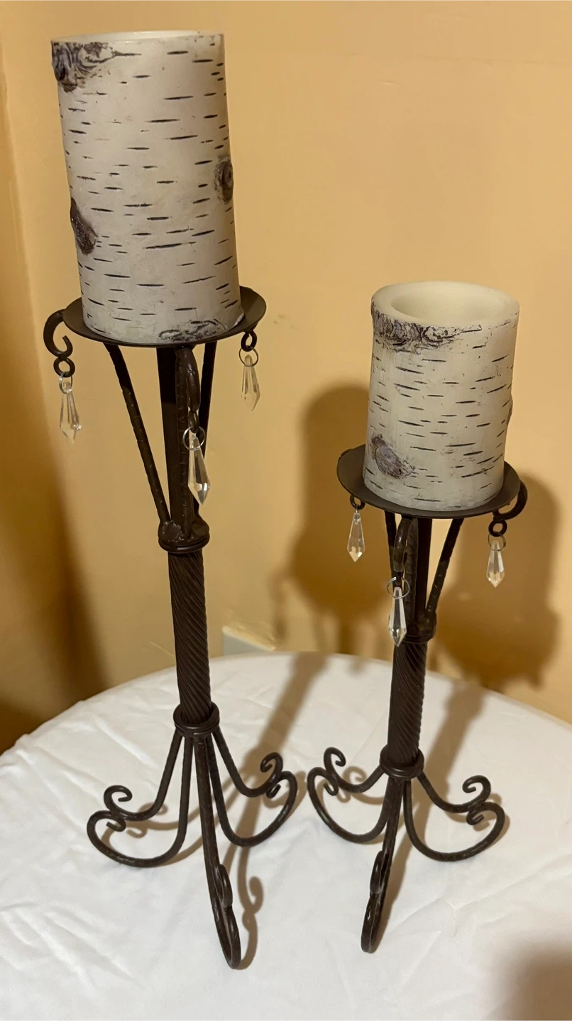 15I'm selling a set of two metal candle holders, They have a rustic, elegant look with wrought iron stands and crystal pendants. They'd be a lovely addition to any room! Candle not included