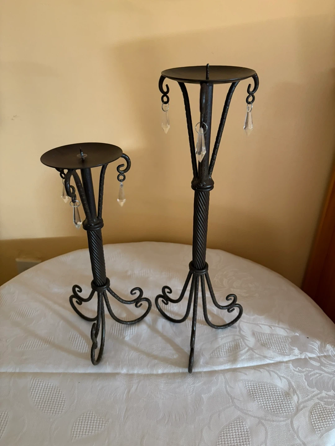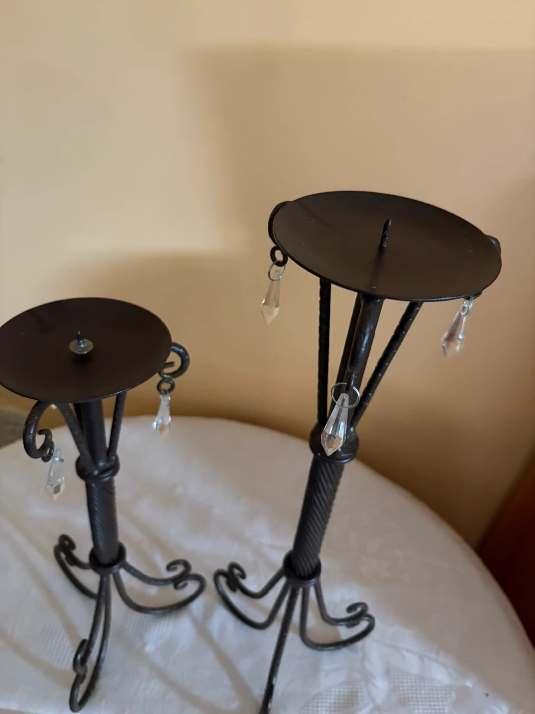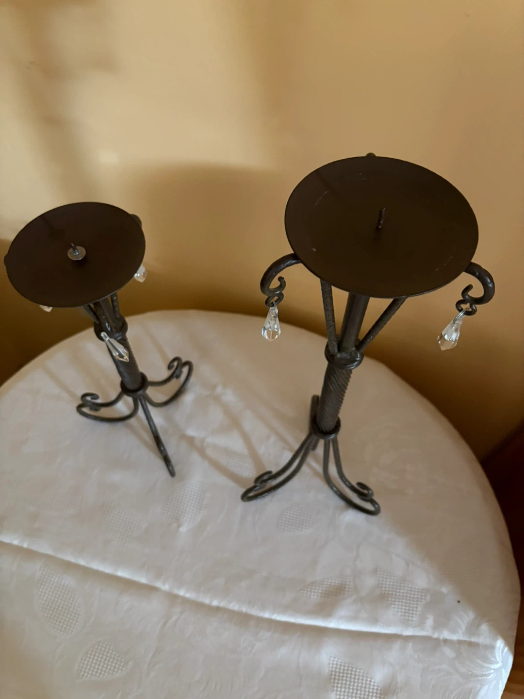 Selling a set of two metal candle holders! They have a dark finish and cute little crystal accents that catch the light. They'd look great on a dining table or mantle!