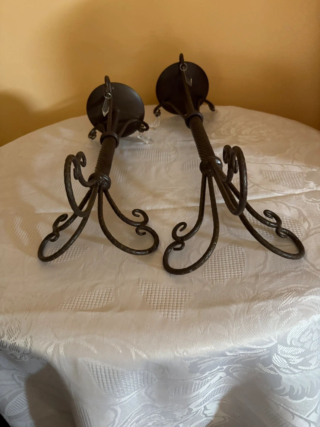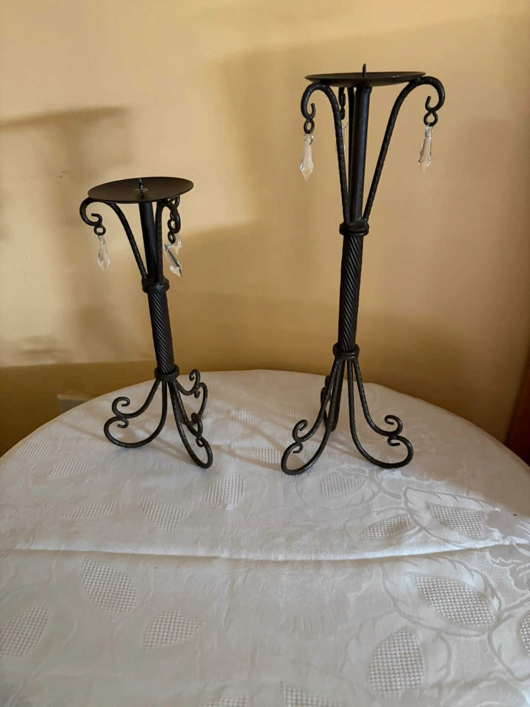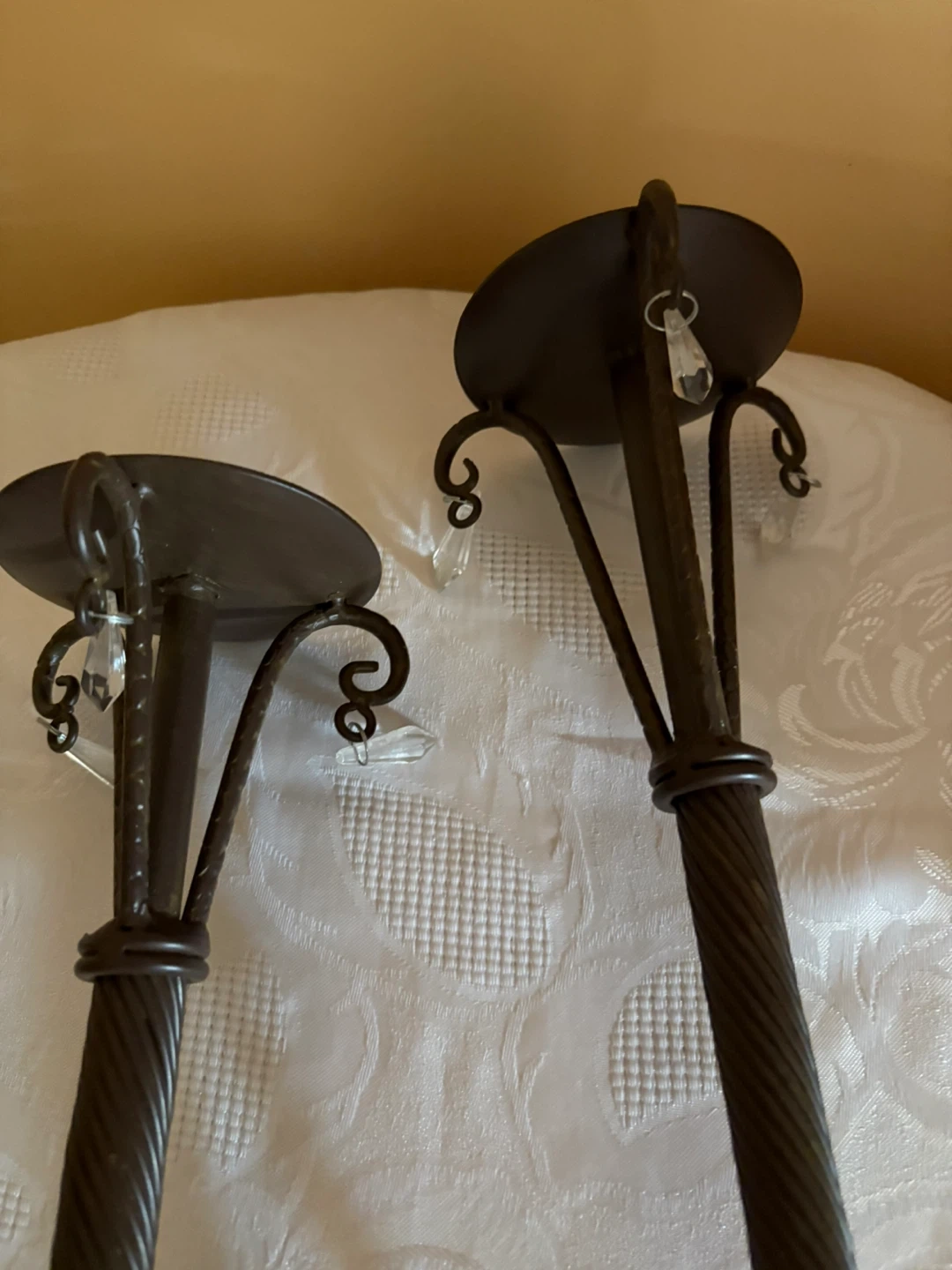 Selling a set of two metal candle holders! They have a dark finish and cute little crystal accents that catch the light. They'd look great on a dining table or mantle!