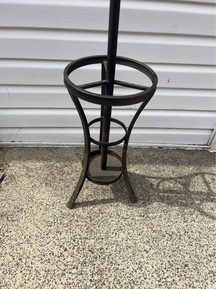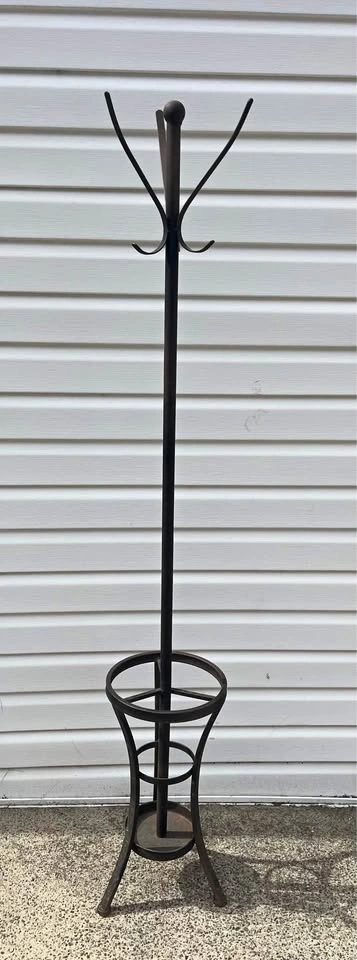 10This is a metal coat and umbrella stand. It’s in good condition and shows some minor superficial rust on the bottom where the umbrellas go. It’s approximately 68 1/2 inches tall. Pickup in Sheepshead Bay Brooklyn.