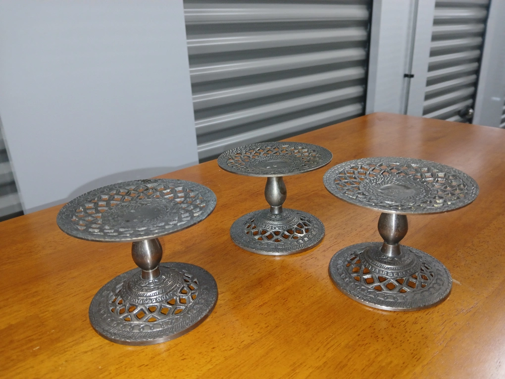 Selling a set of 3 decorative metal pedestal stands. They have an intricate, filigree-like design on the top and base. Perfect for adding a touch of elegance to your home decor