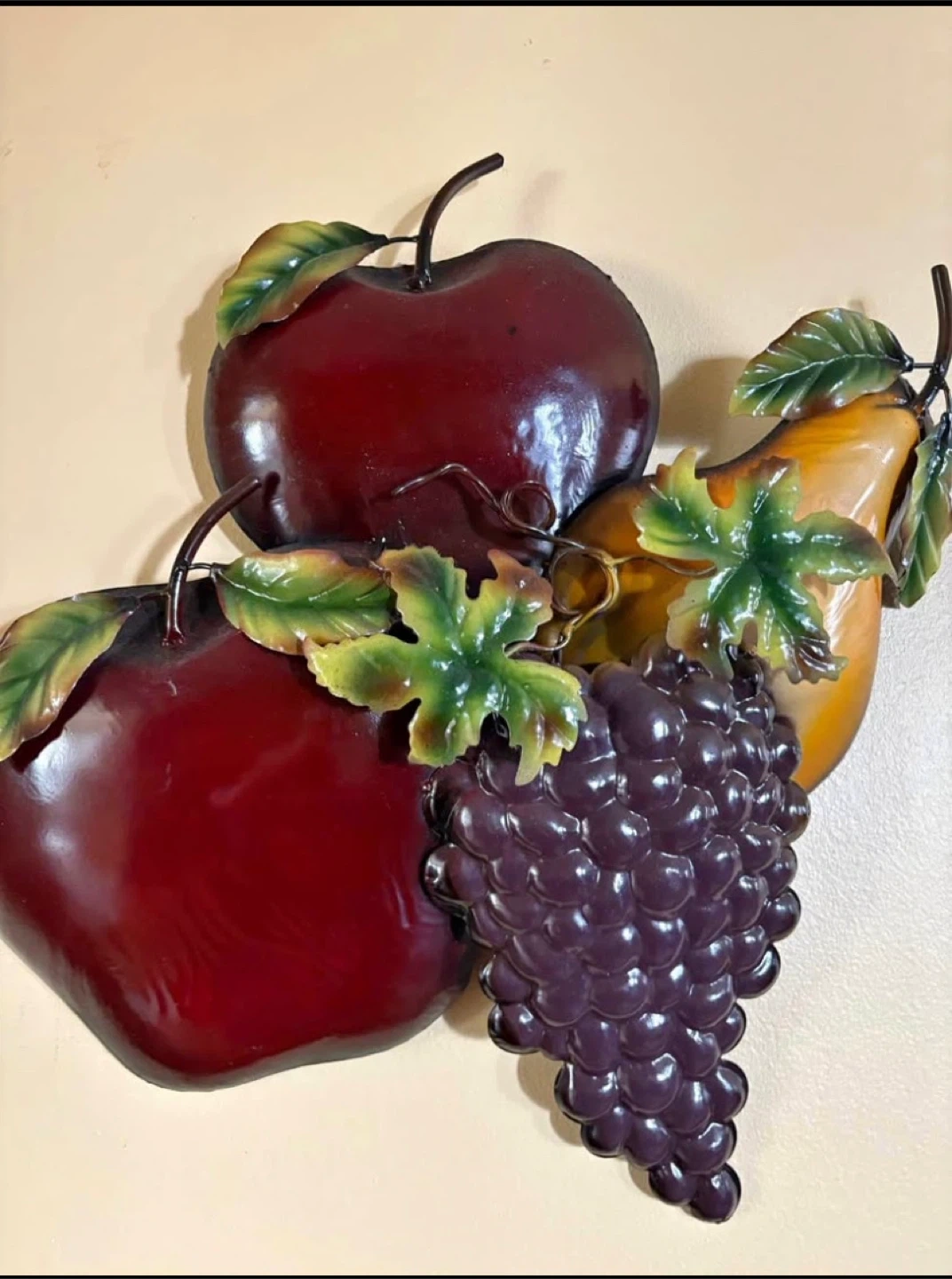 This is a metal fruit wall decor featuring apples, pears, and grapes. It would look great in a kitchen or dining room!