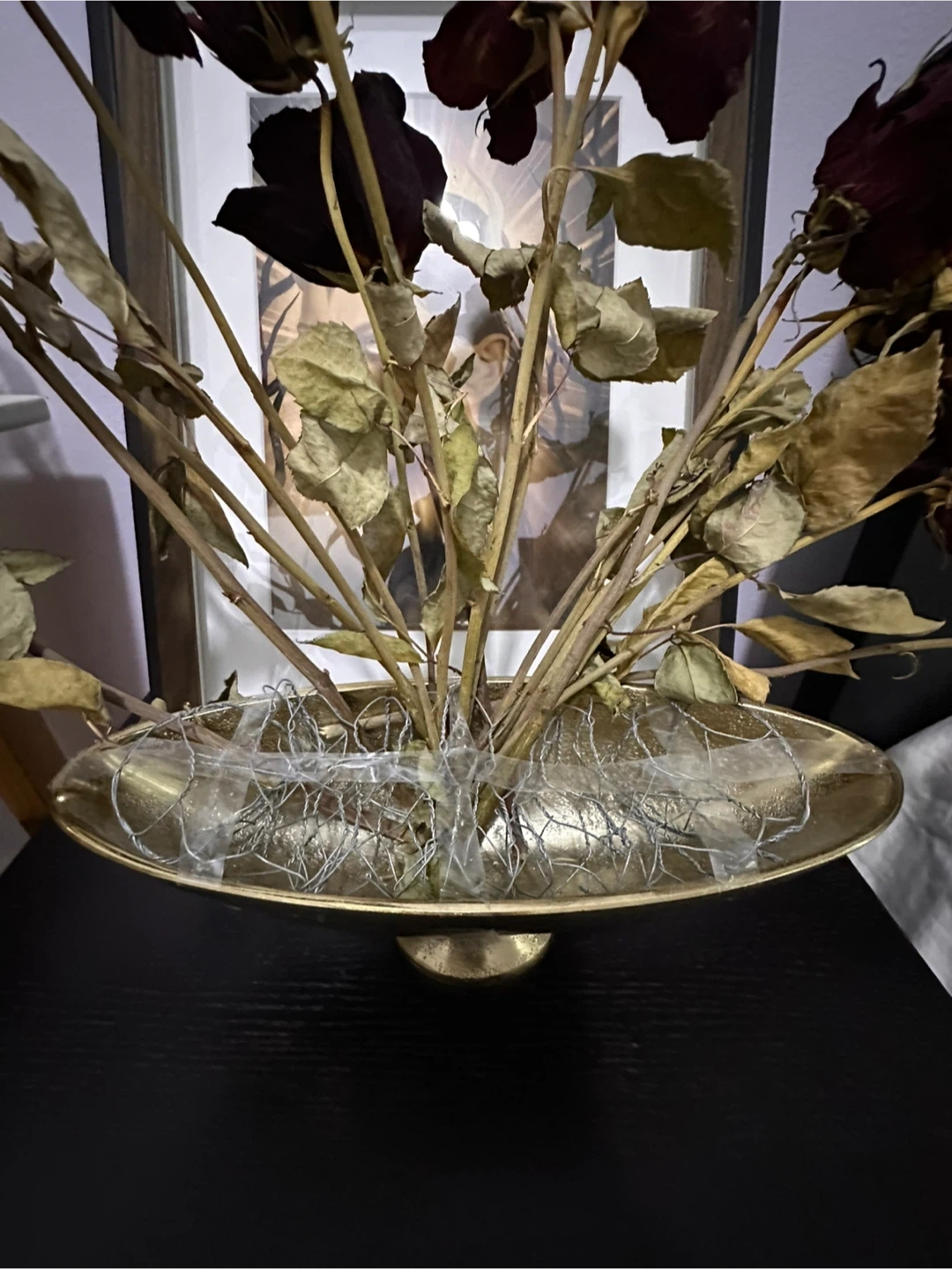 10Selling a decorative gold-colored metal bowl. It's perfect for displaying flowers or other decorative items. The bowl is in perfect condition and ready to add a touch of elegance to your home decor