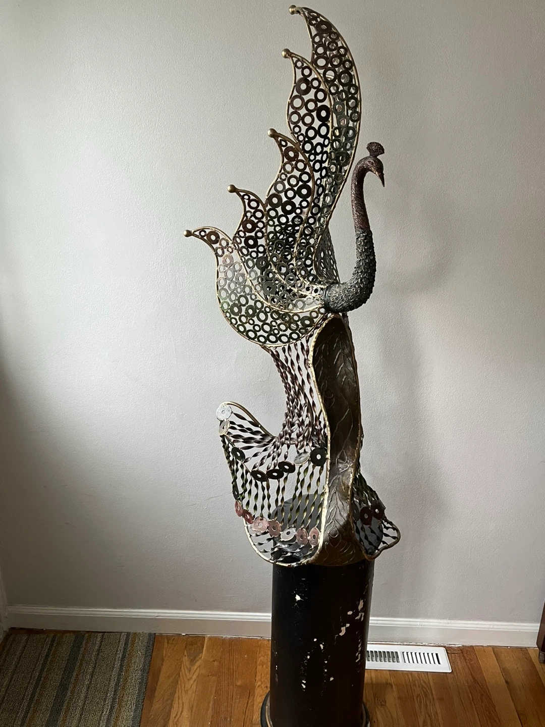 This is a beautiful metal peacock sculpture that would make a great addition to any home. Unique design.
