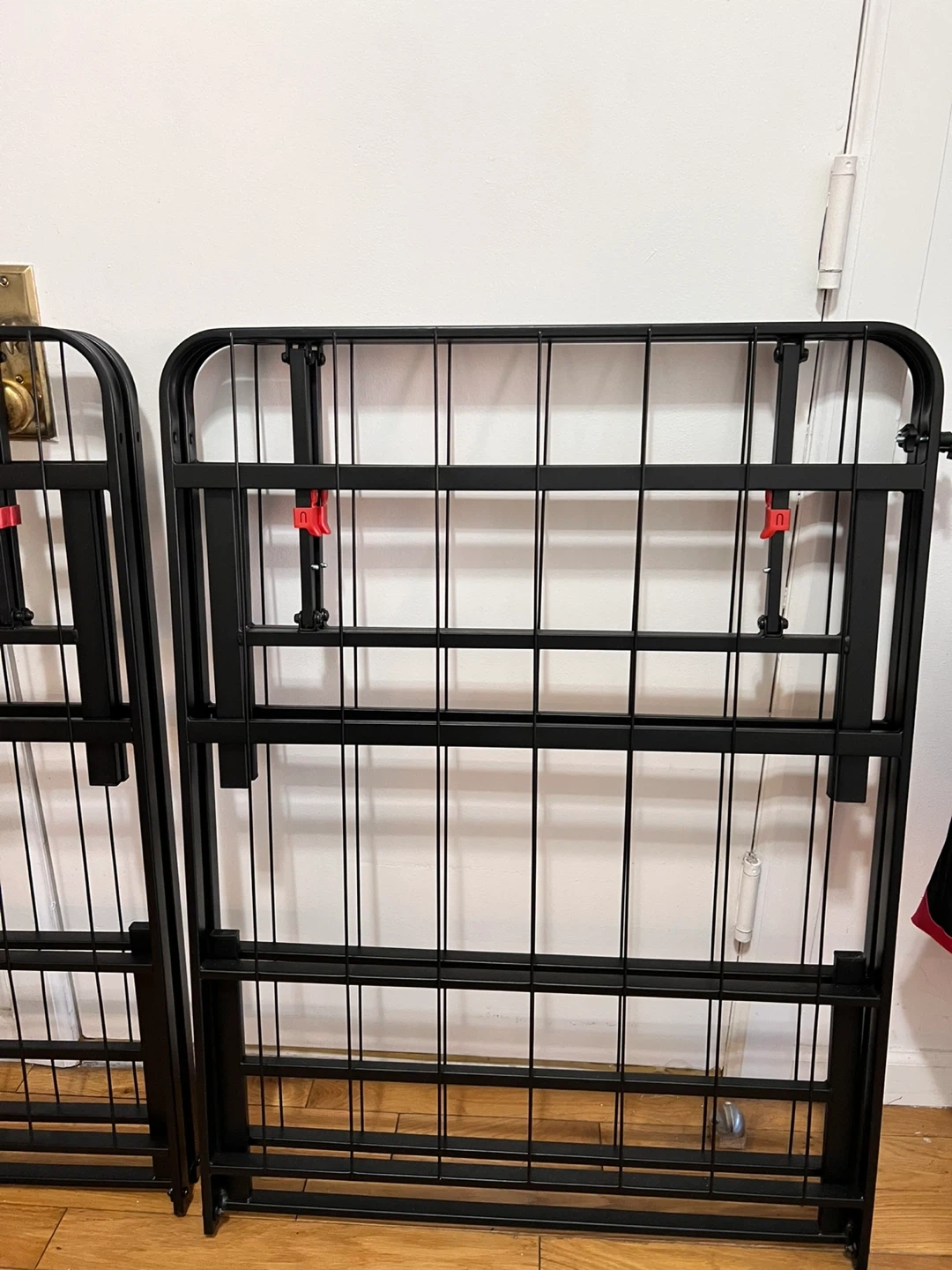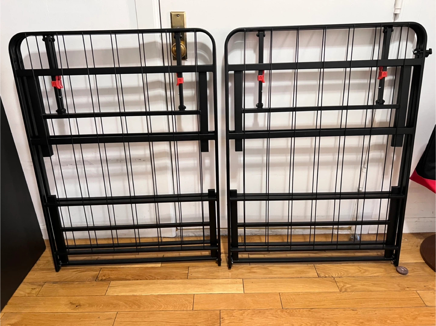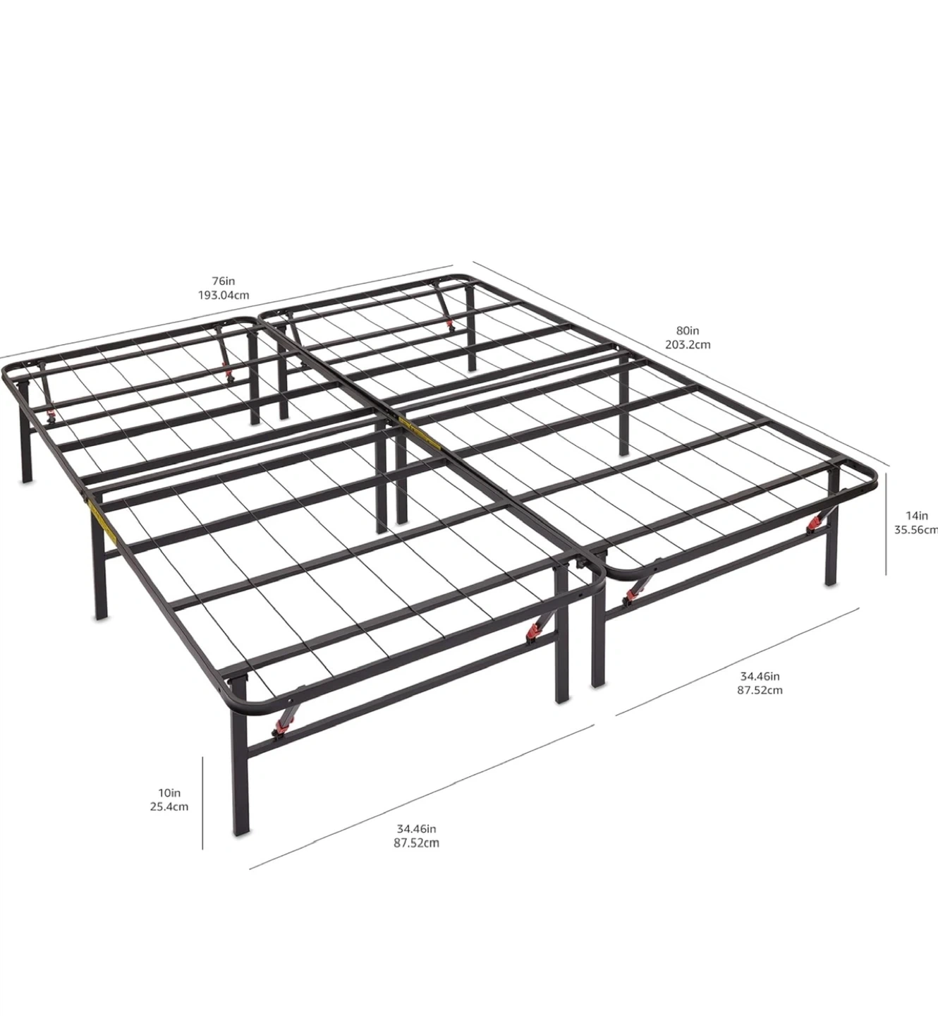 Selling a full-size metal platform Queen bed frame. It's black and in good condition. The dimensions are approximately 76 inches by 80 inches and 14 inches high. Easy to assemble and disassemble!