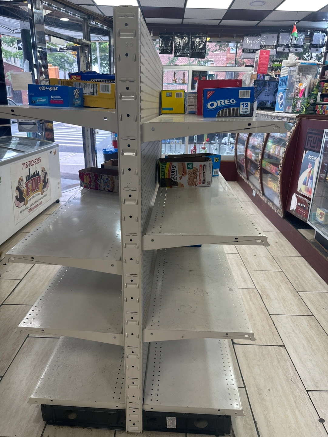 15White metal retail store shelf with 5 shelves. This shelf has some visible wear and tear. Shelf can be used in a variety of settings including a retail store, garage or workshop, or home.