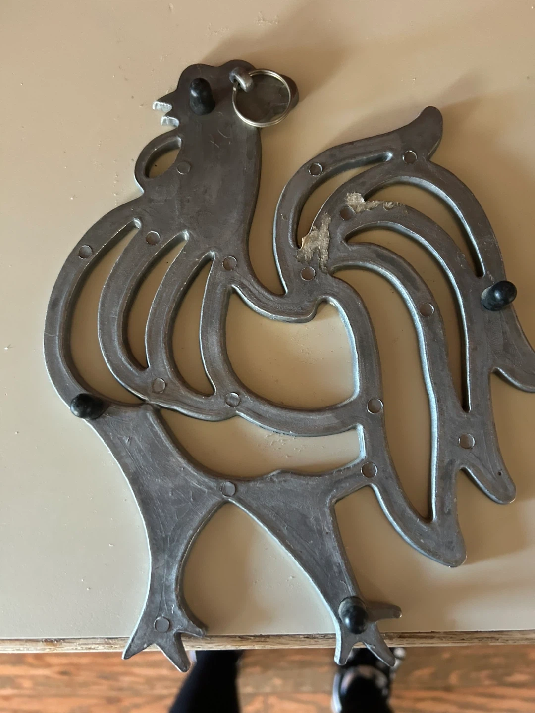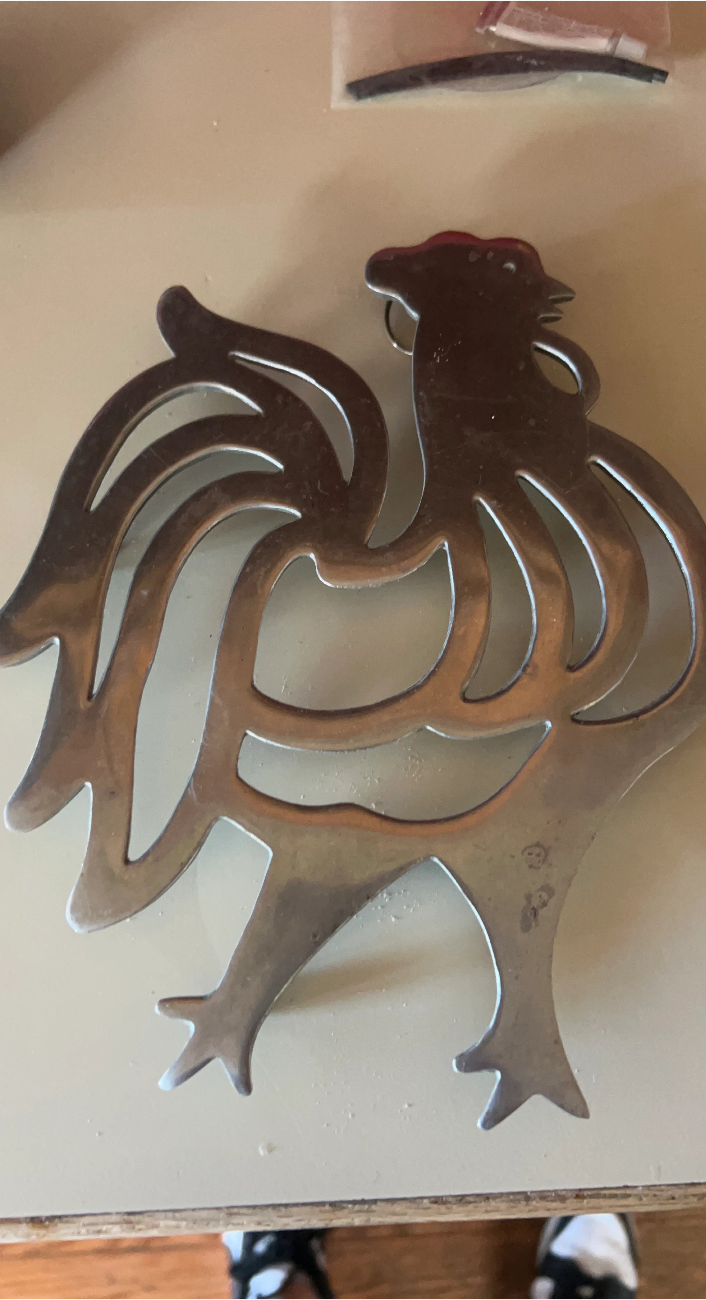 10Selling a metal rooster trivet. It's in good condition and ready to protect your table from hot dishes! It has a unique design and is perfect for adding a touch of rustic charm to your kitchen.