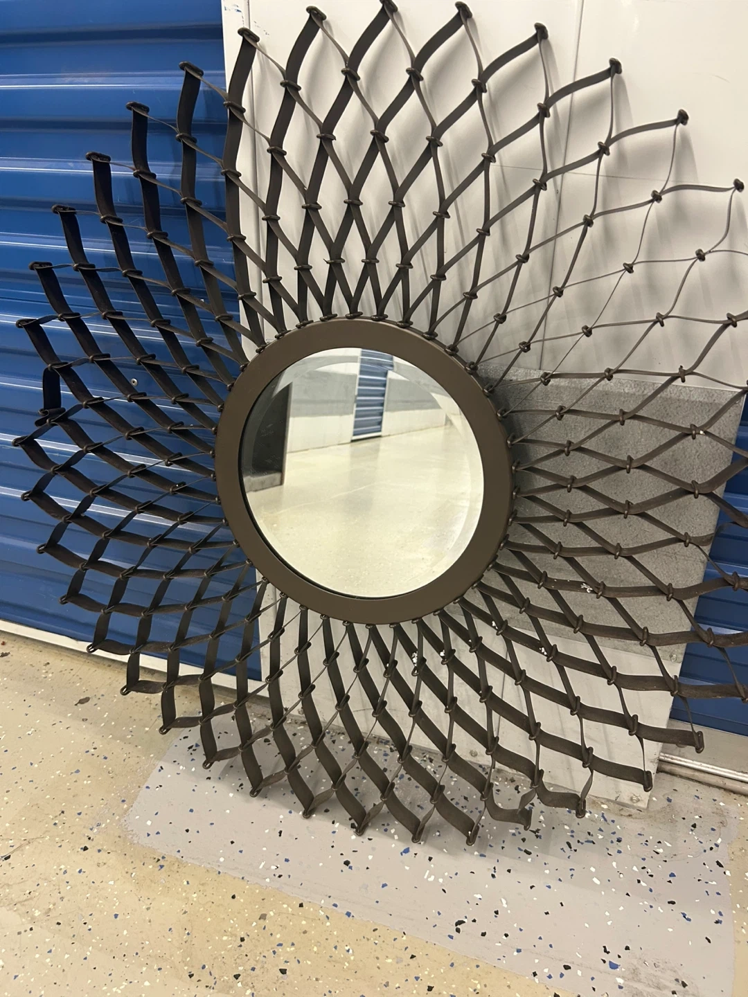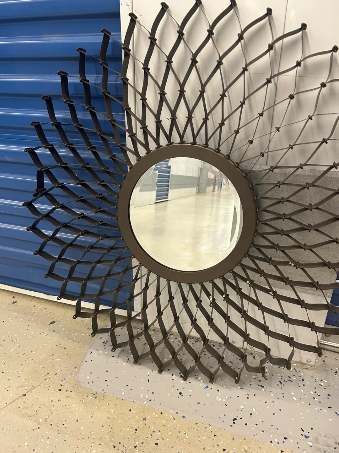 15This is a stylish metal round wall mirror. It features a unique webbed design around the circular mirror. It will add a modern touch to any room!