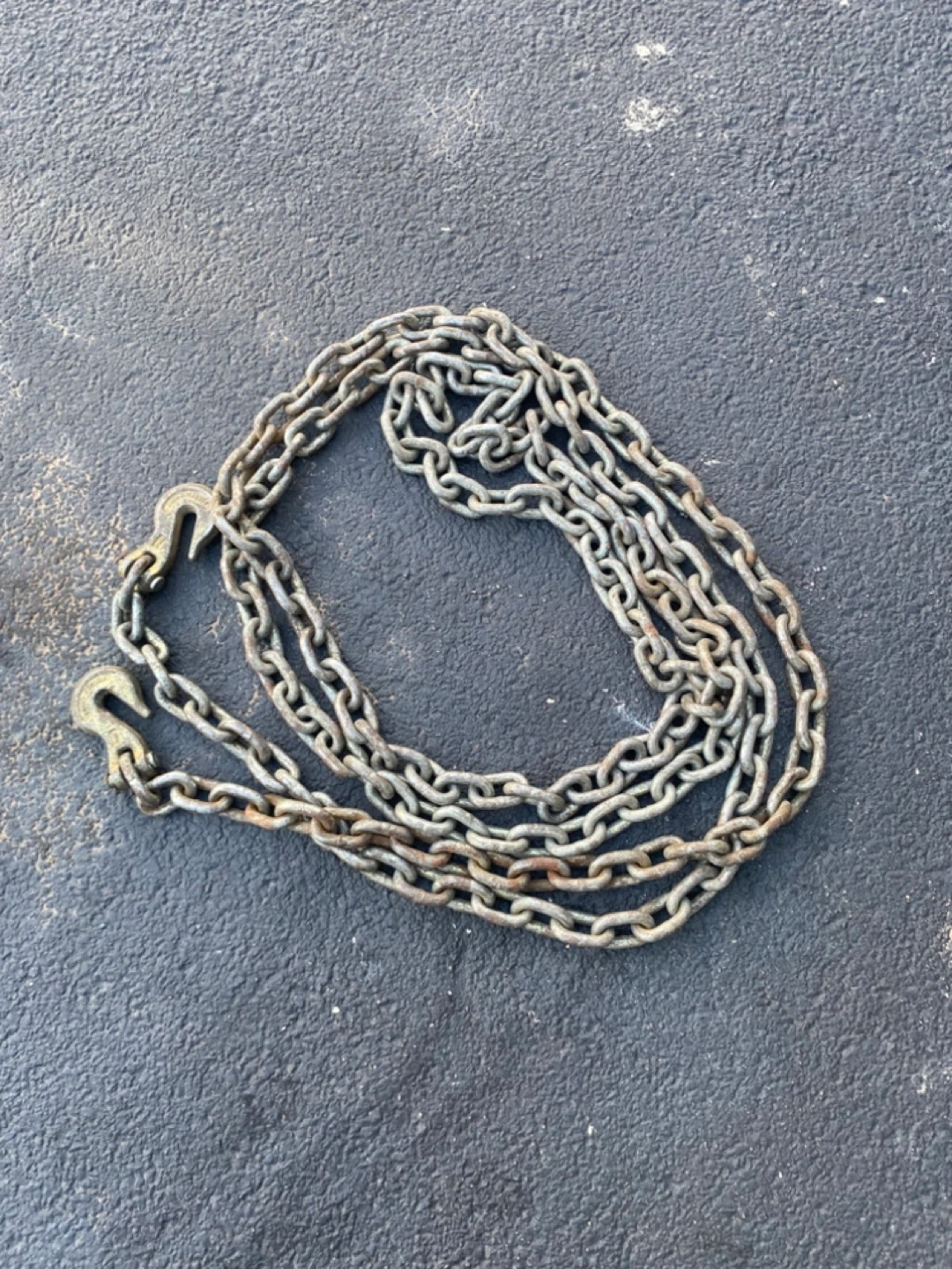 10Selling a used metal tow chain with hooks. It shows some signs of wear and could use a cleaning, but it's still functional for towing or securing items