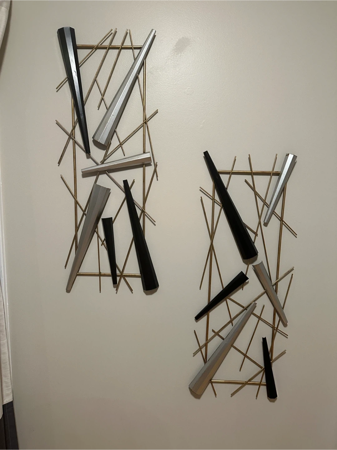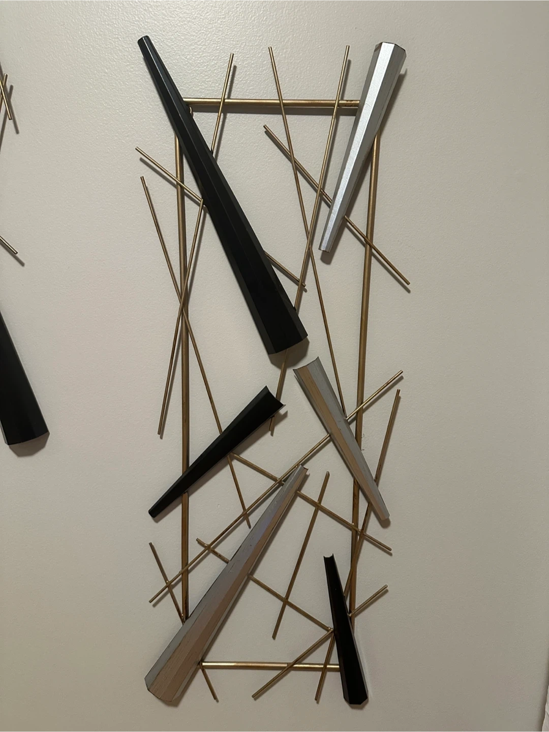 Add a touch of modern art to your home with this metal wall decor! It features a unique design with black, silver, and gold accents. Perfect for adding a stylish and contemporary feel to any room