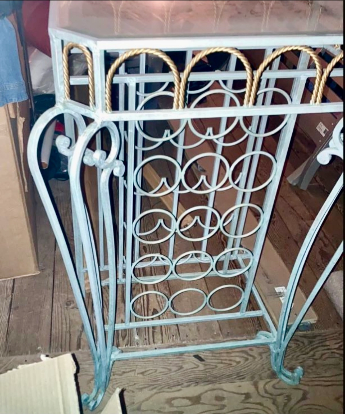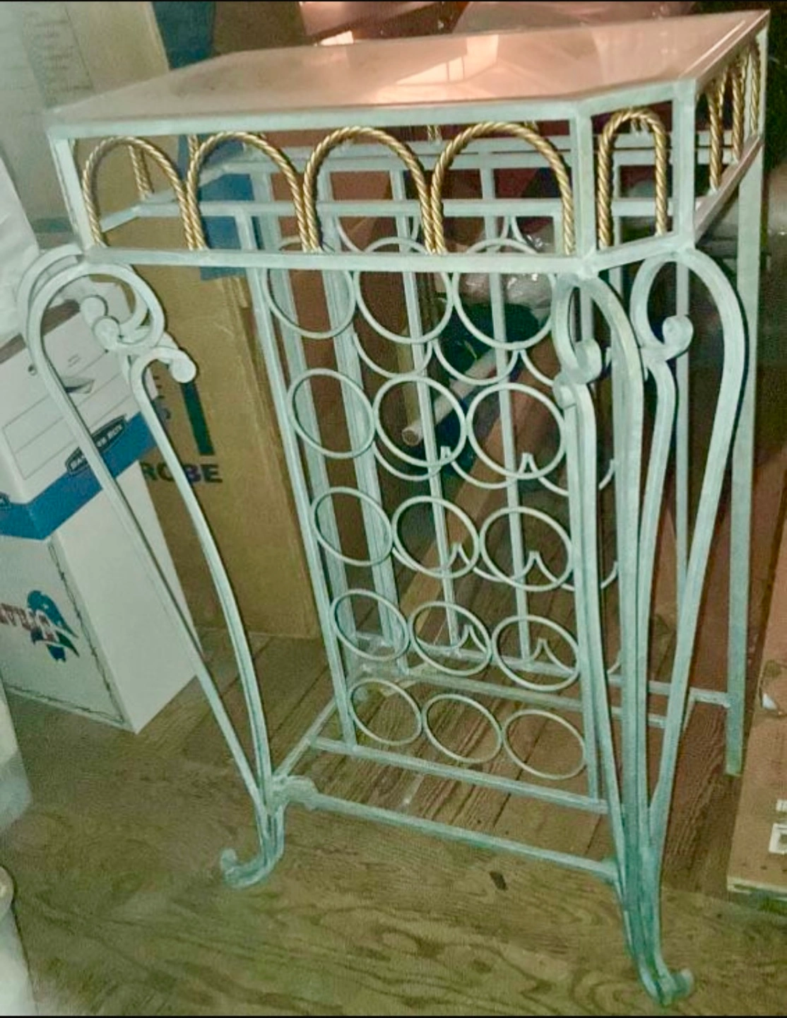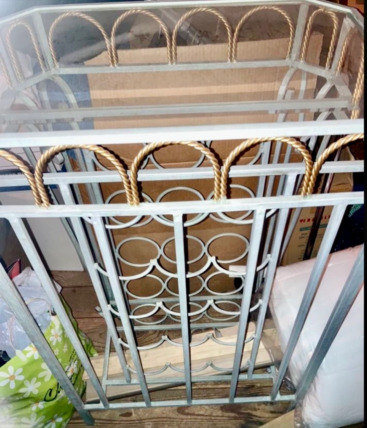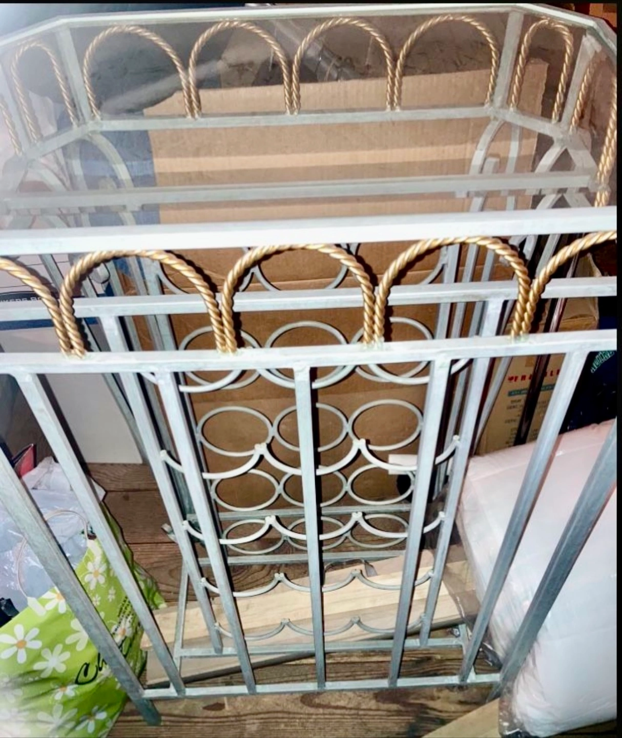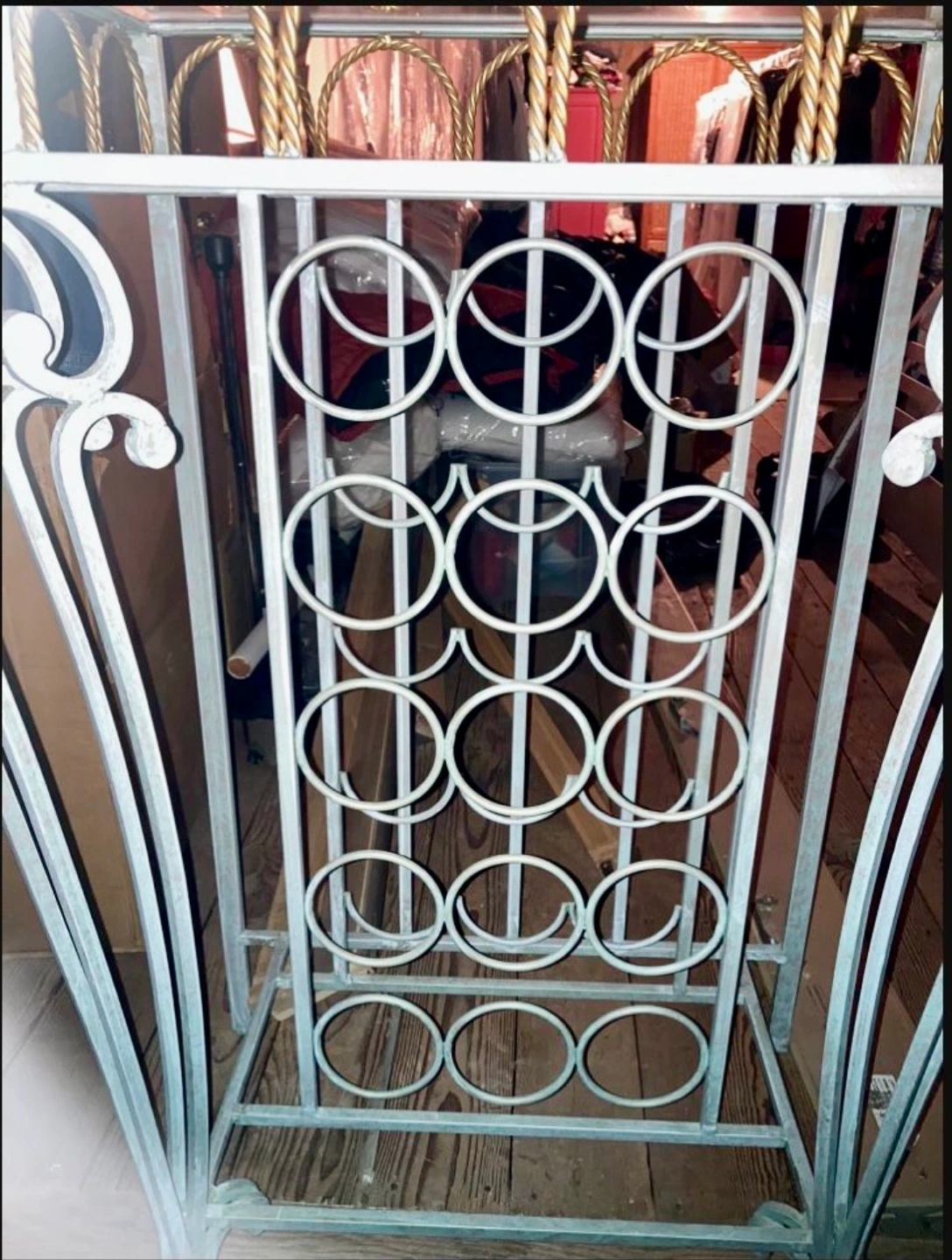 This is a versatile metal rack that can be used as a wine rack or a baker's rack. It has a light green color with gold accents. It has some signs of wear, but it's still in good condition and ready for a new home. Bakers Rack & Wine Rack, Elegant metal shelf. Use in Kitchen or any space needing a beautiful piece! Beautiful sage green with gold! Bakers Rake + Wine Rack with Glass tops. 15 bottles of wine! Approximate Dimensions for Bakers Rack: 49" wide x 85" height x 13" deep (with curve 18.5" deep) Top of Bakers Rack has a tiny chip in paint but just a little touchup will work. Approximate Dimensions for Wine Rack: 27.5" wide x 41" height x 16.5" deep Open to Offers!