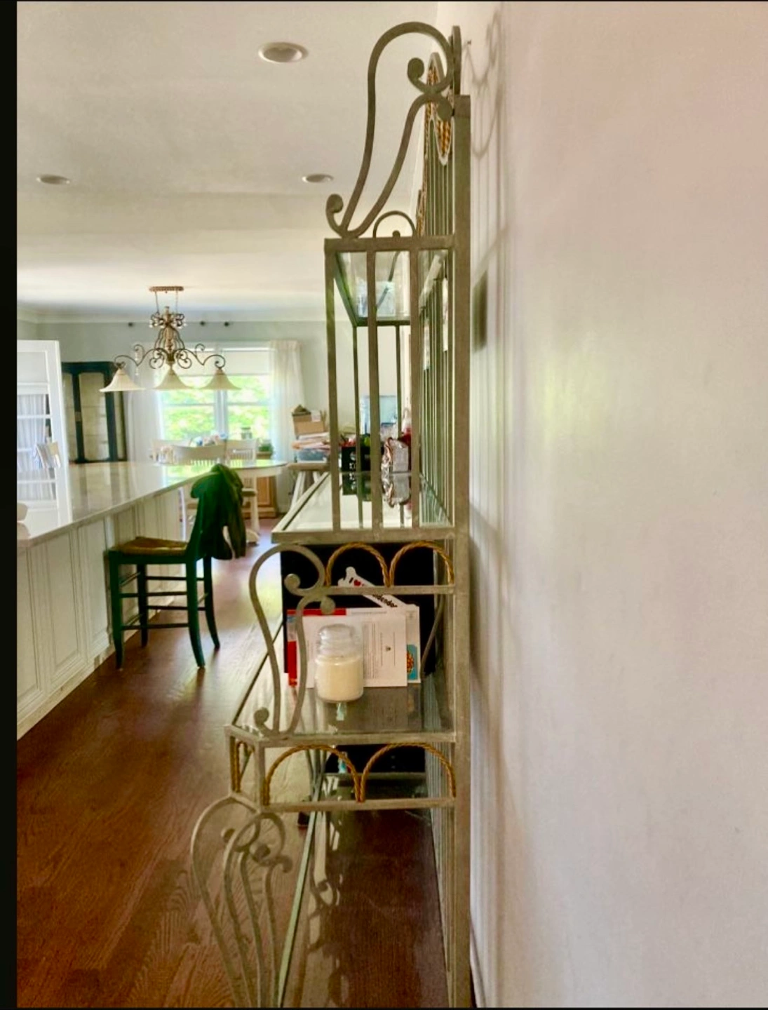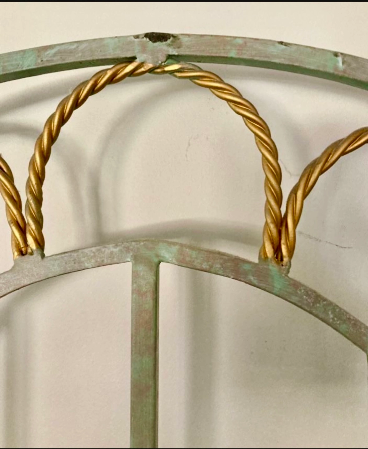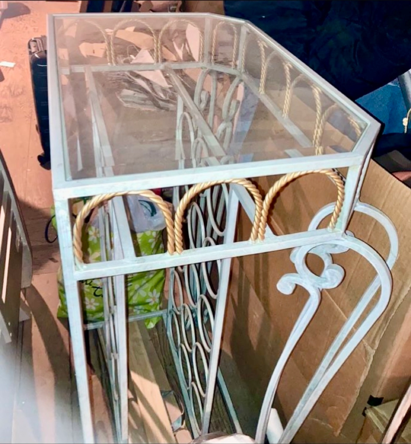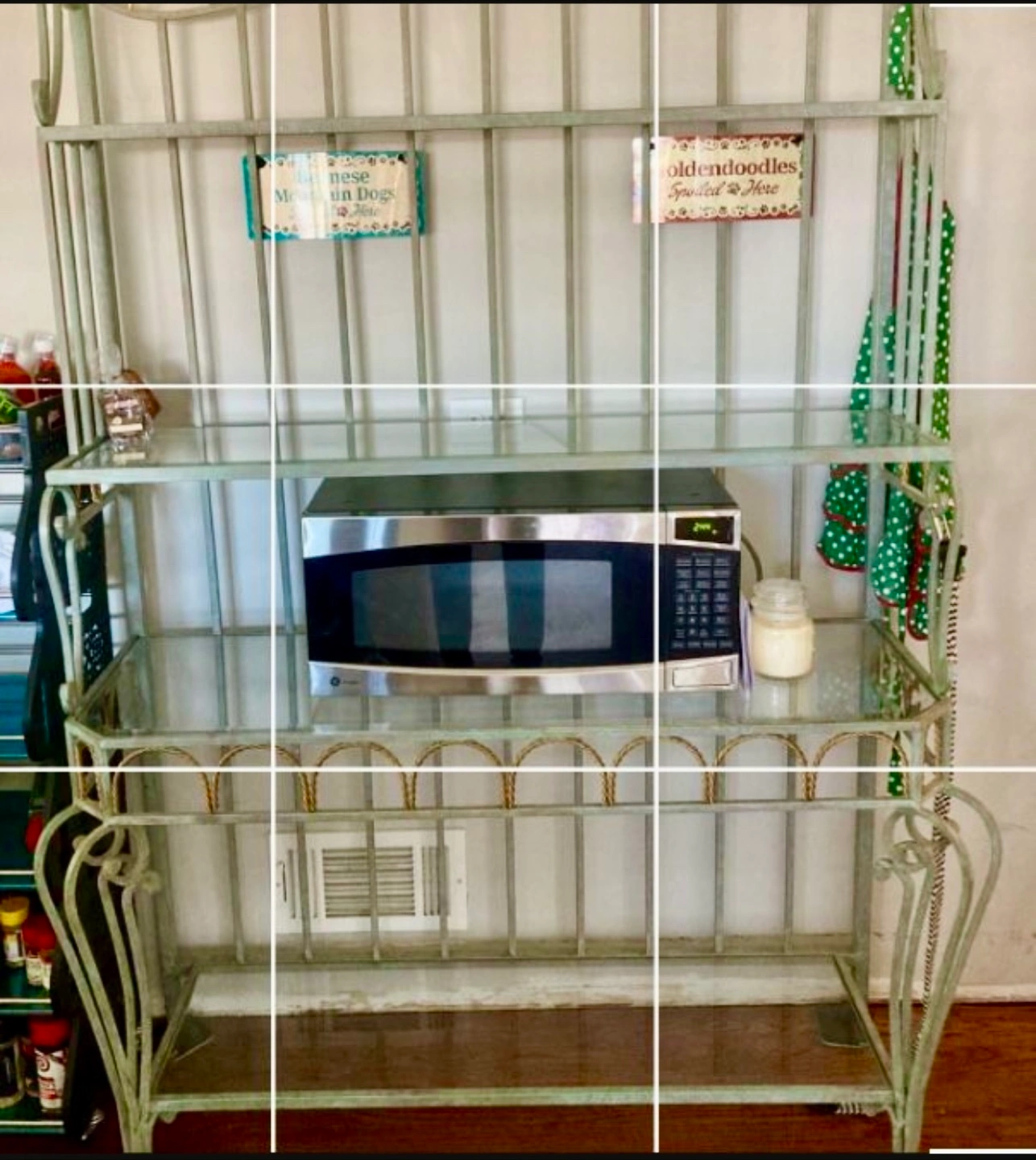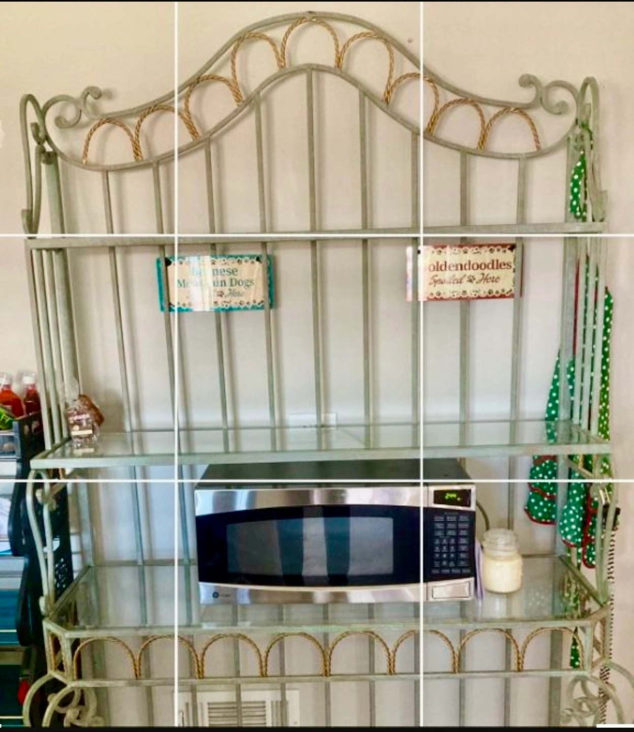 This is a versatile metal rack that can be used as a wine rack or a baker's rack. It has a light green color with gold accents. It has some signs of wear, but it's still in good condition and ready for a new home. Bakers Rack & Wine Rack, Elegant metal shelf. Use in Kitchen or any space needing a beautiful piece! Beautiful sage green with gold! Bakers Rake + Wine Rack with Glass tops. 15 bottles of wine! Approximate Dimensions for Bakers Rack: 49" wide x 85" height x 13" deep (with curve 18.5" deep) Top of Bakers Rack has a tiny chip in paint but just a little touchup will work. Approximate Dimensions for Wine Rack: 27.5" wide x 41" height x 16.5" deep Open to Offers!