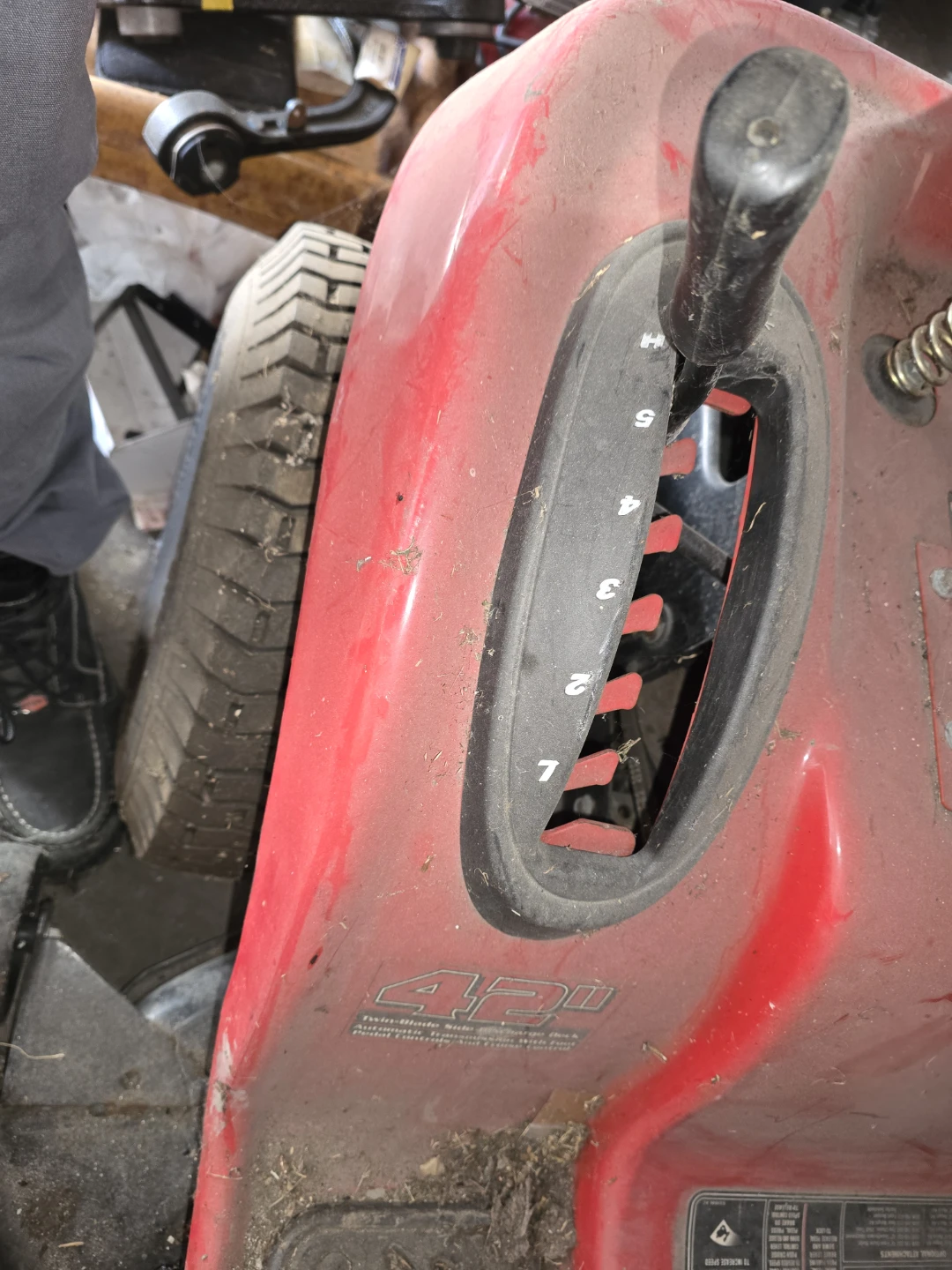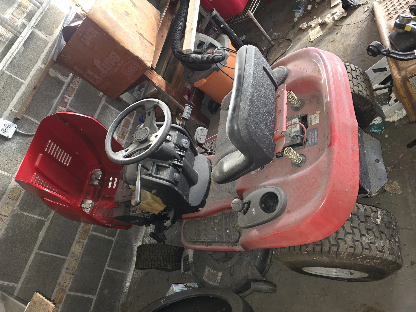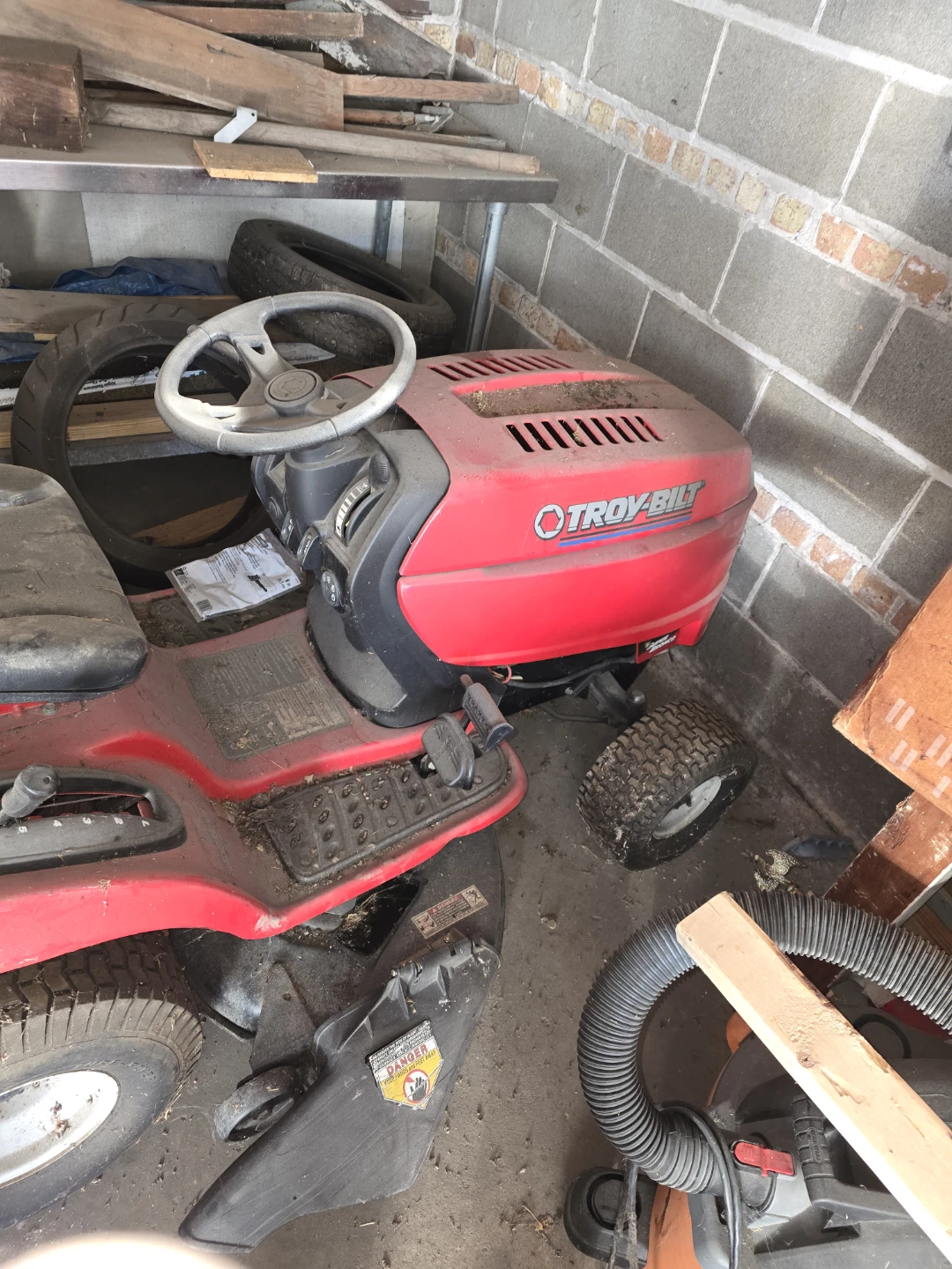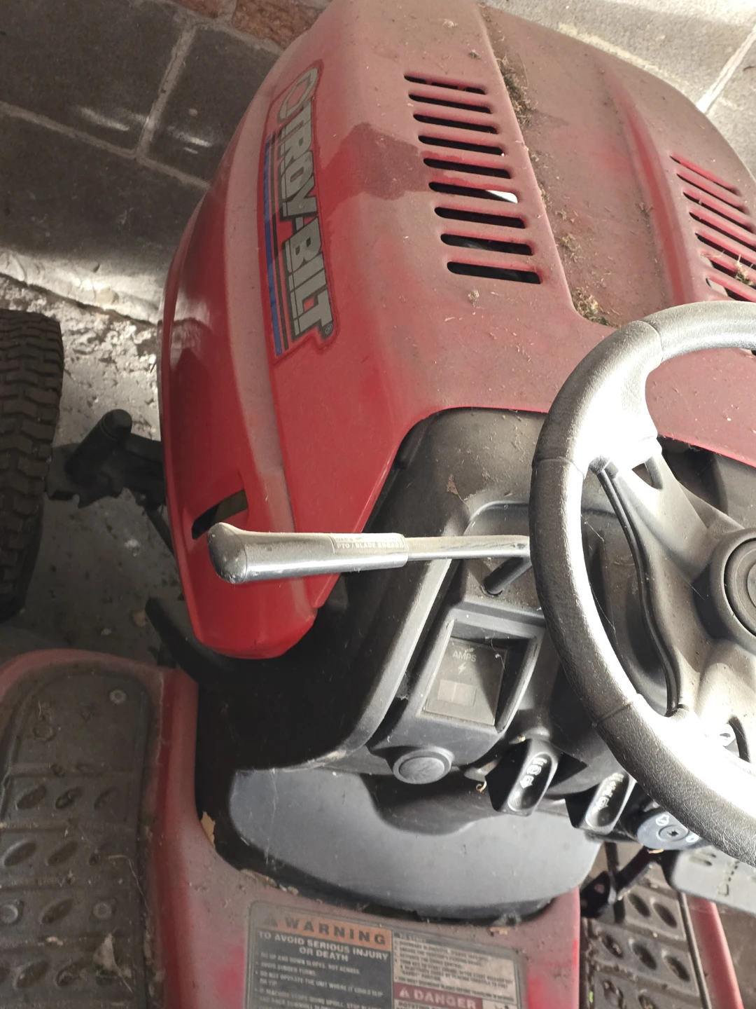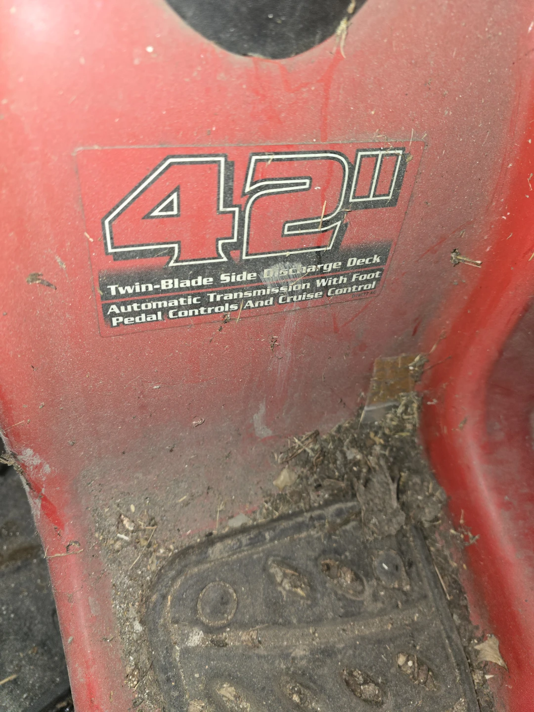 Troy-Bilt riding lawn mower with a 42" twin-blade side discharge deck. It features automatic transmission with foot pedal controls and cruise control. This mower is designed for efficient lawn care. Needs battery and key make an offer those two items aren't that expensive but i need it gone asap my dad's gone house is sold need it gone asap best offer cash takes it I've posted before price cut βοΈ 800 obo cash πΈ π°