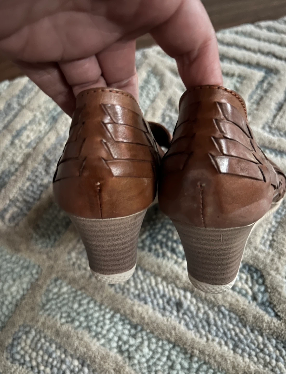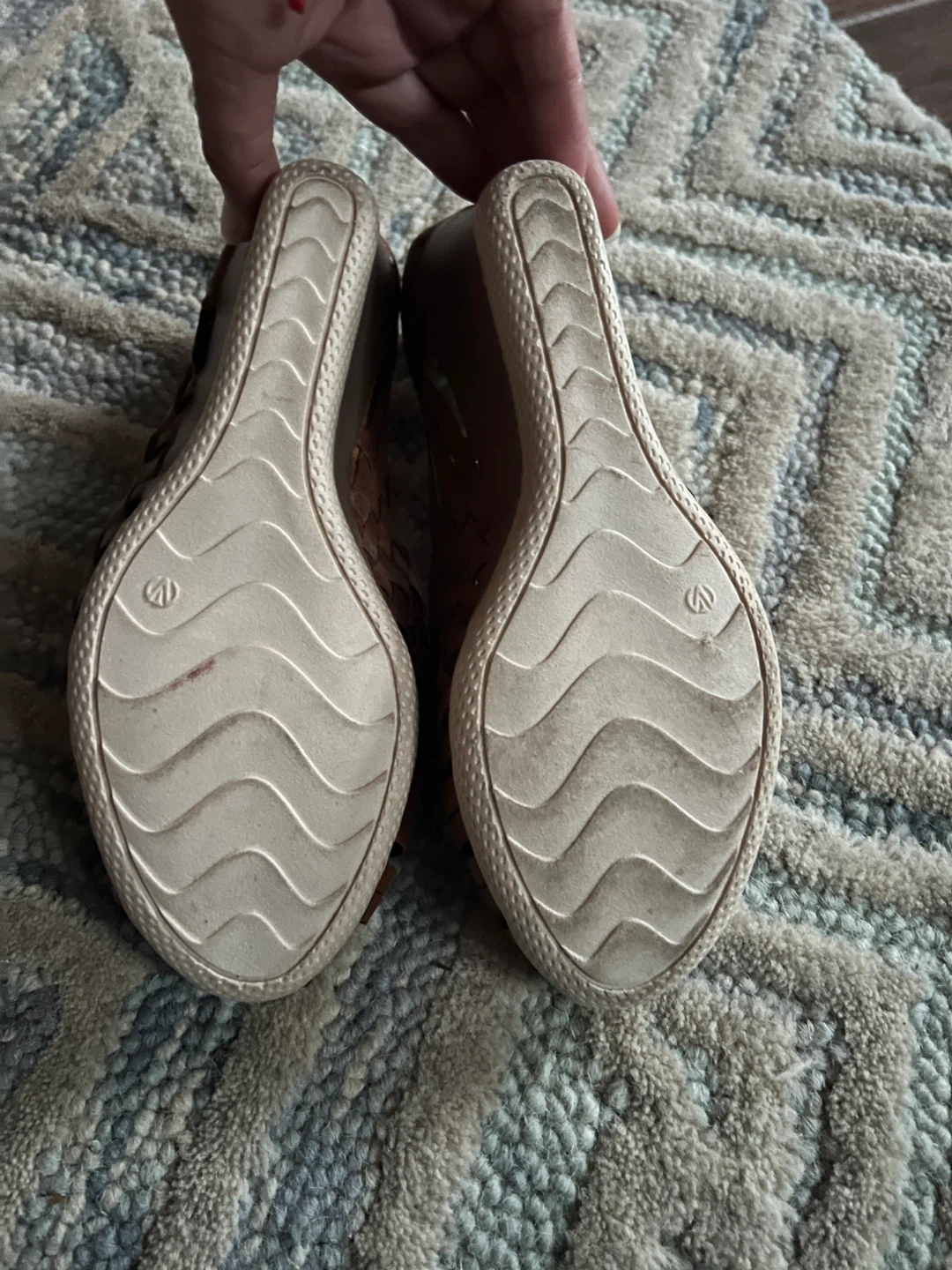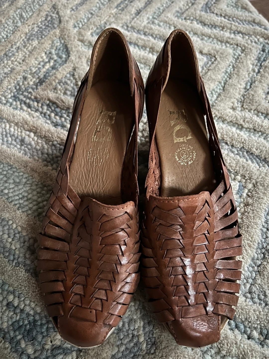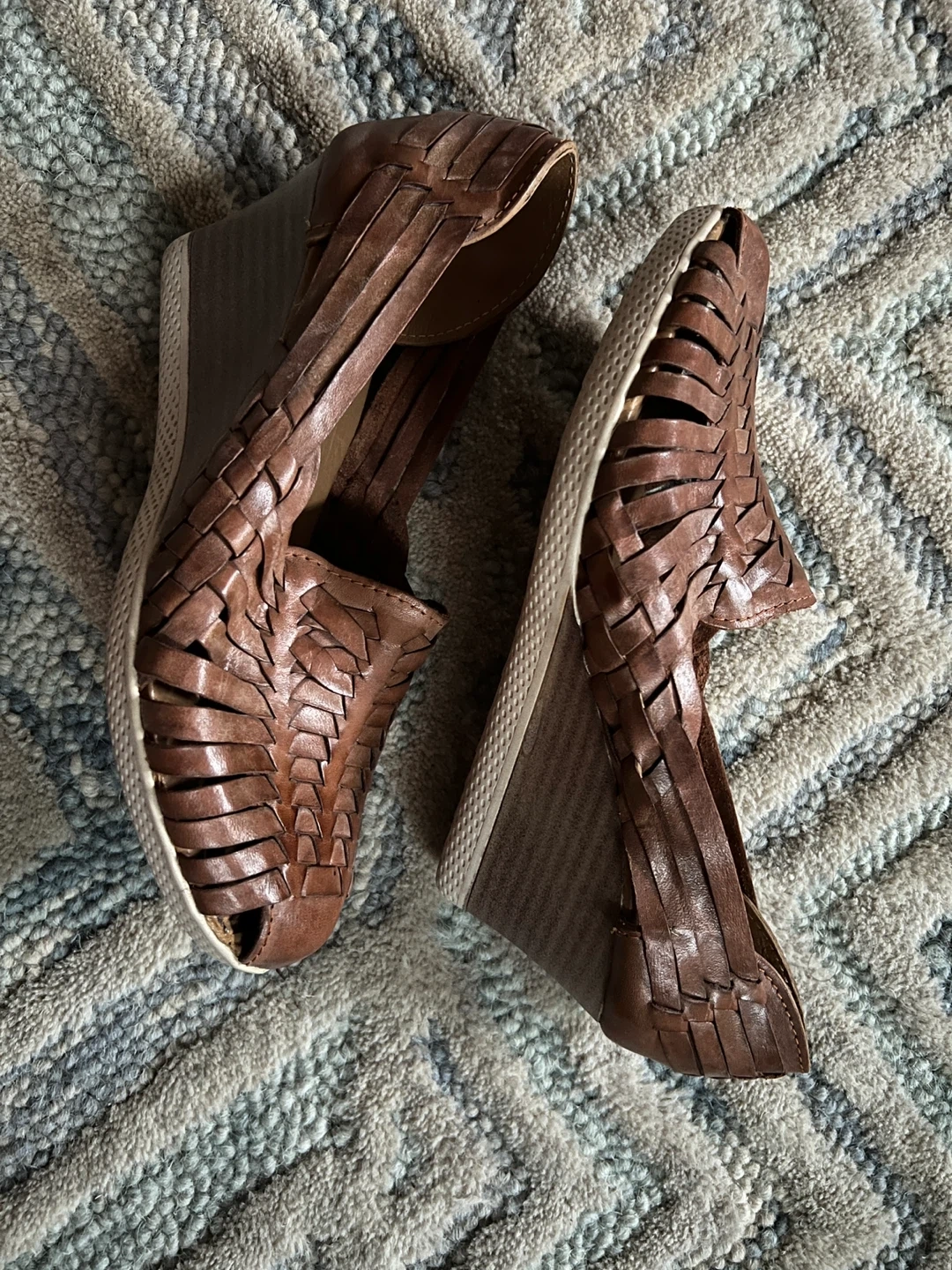 These are a pair of Mexican brown woven leather wedge sandals. They are in good condition and have a unique woven design. Perfect for any occasion! Size 8.