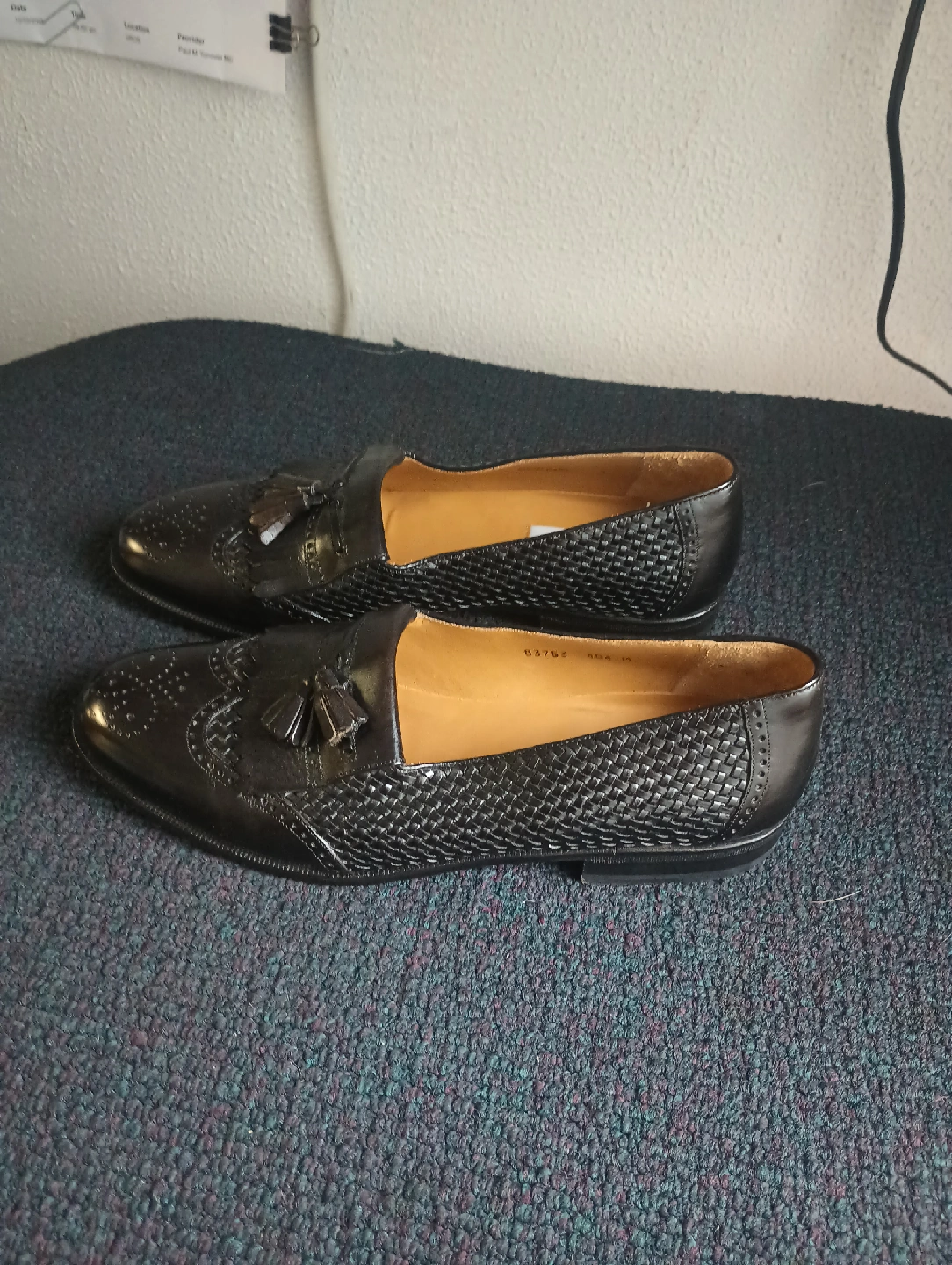 10Selling a pair of Meylan loafers in black leather. They have a stylish tassel detail and a unique woven texture. These are in great condition and ready for a new home!