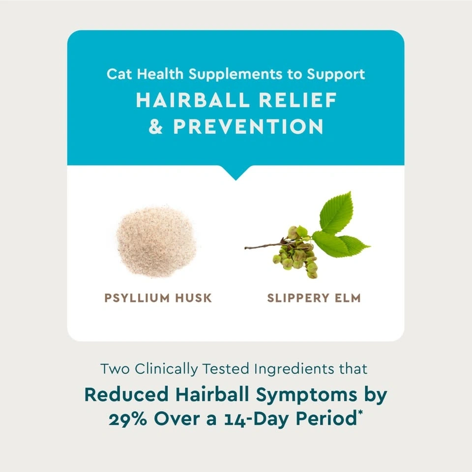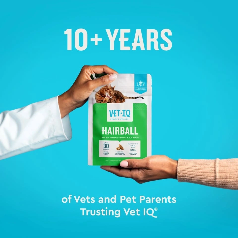 New Vet-IQ hairball chews for cats. Helps with hairball relief, normal digestion, and gut health. Chicken flavored. Made with psyllium husk and slippery elm. Veterinarian recommended. Approx 30 day supply. Net weight 3.7 oz (104g). No artificial ingredients. Made in USA with global ingredients.