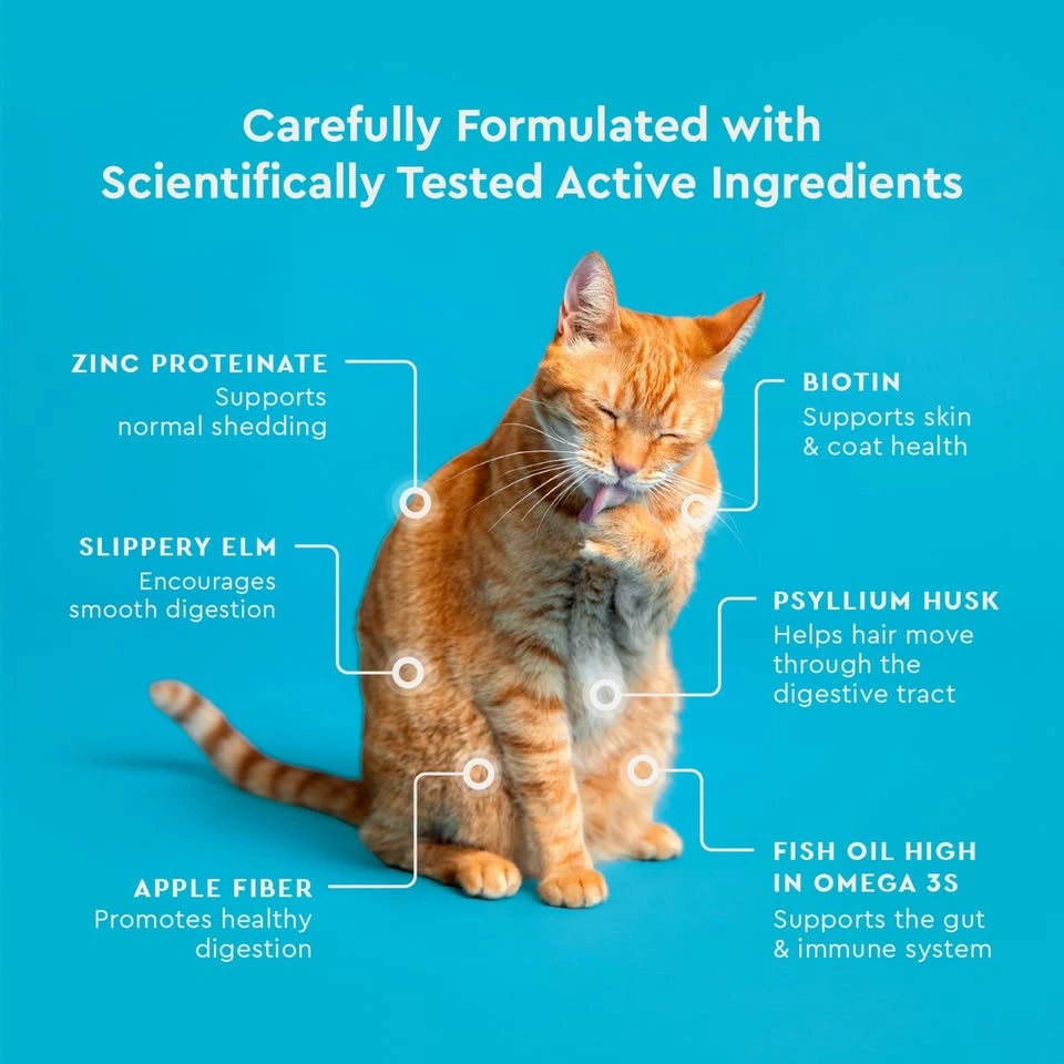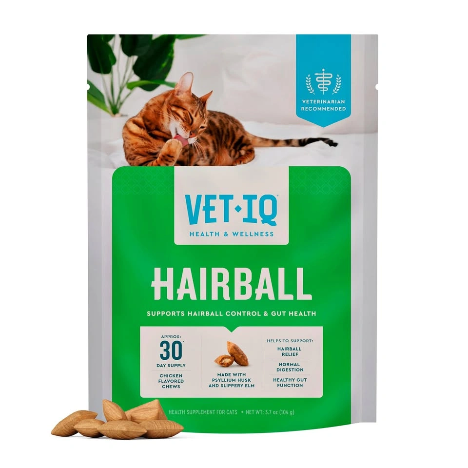 New Vet-IQ hairball chews for cats. Helps with hairball relief, normal digestion, and gut health. Chicken flavored. Made with psyllium husk and slippery elm. Veterinarian recommended. Approx 30 day supply. Net weight 3.7 oz (104g). No artificial ingredients. Made in USA with global ingredients.