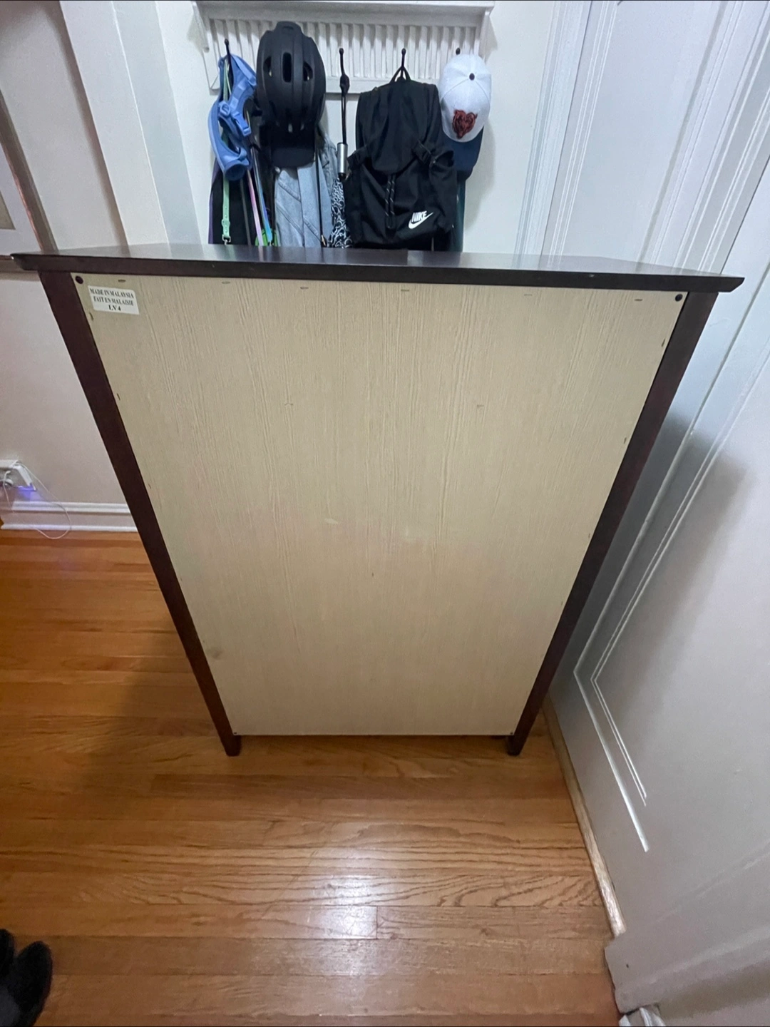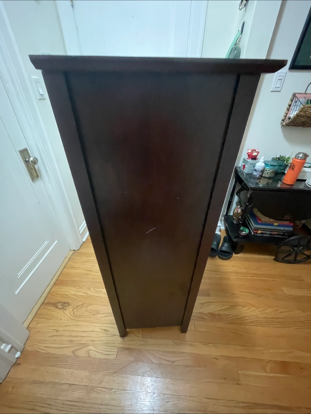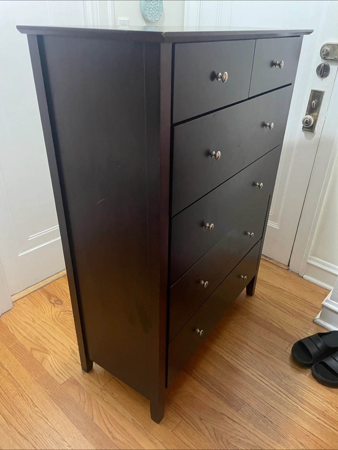 Selling a dark wood dresser with six drawers. It's in good condition and would be great for a bedroom or closet. The dresser has a clean and simple design that will fit in with any decor. There are a few scratches on the top, and one on a drawer. One drawer needs a new track. It’s not the style we want and don’t have energy to fix it.