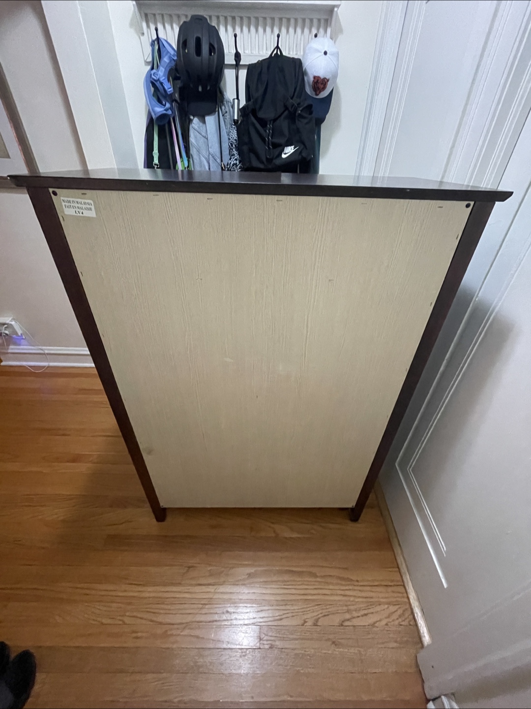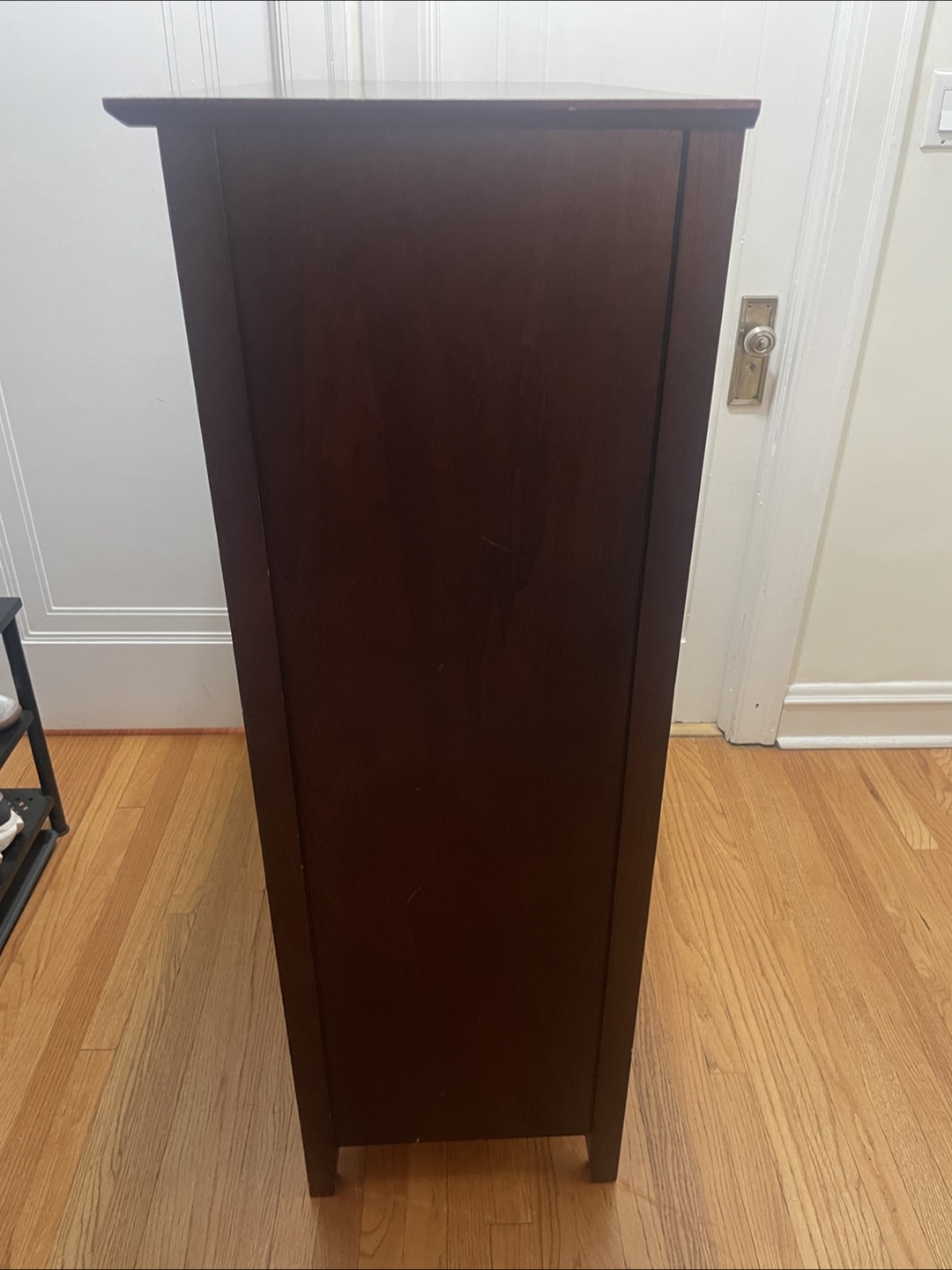 Selling a dark wood dresser with six drawers. It's in good condition and would be great for a bedroom or closet. The dresser has a clean and simple design that will fit in with any decor. There are a few scratches on the top, and one on a drawer. One drawer needs a new track. It’s not the style we want and don’t have energy to fix it.
