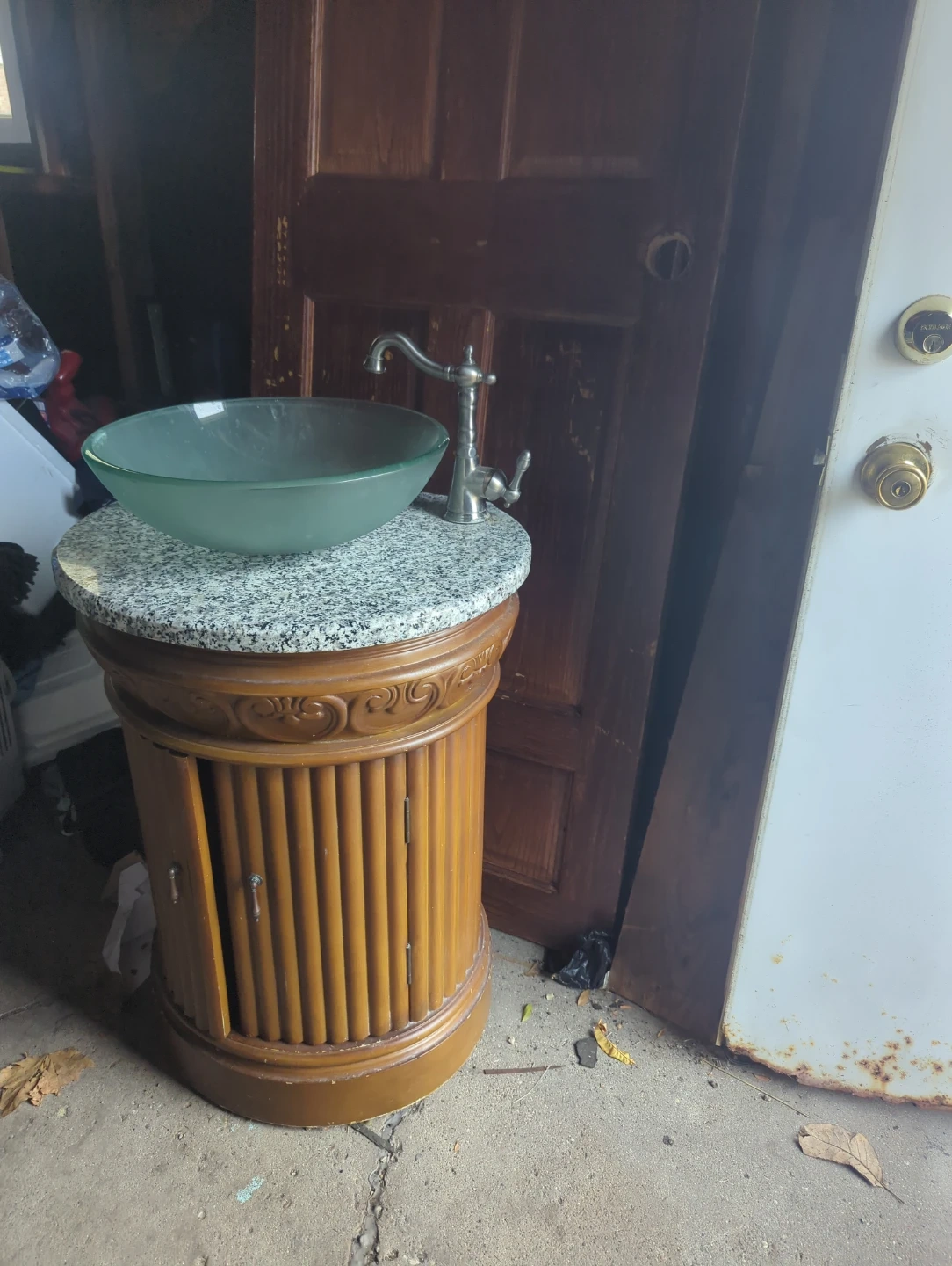 Selling a used bathroom vanity with a glass bowl sink. The vanity features a wooden cabinet with a granite top. The sink is a stylish glass bowl. Perfect for a small bathroom or powder room!
