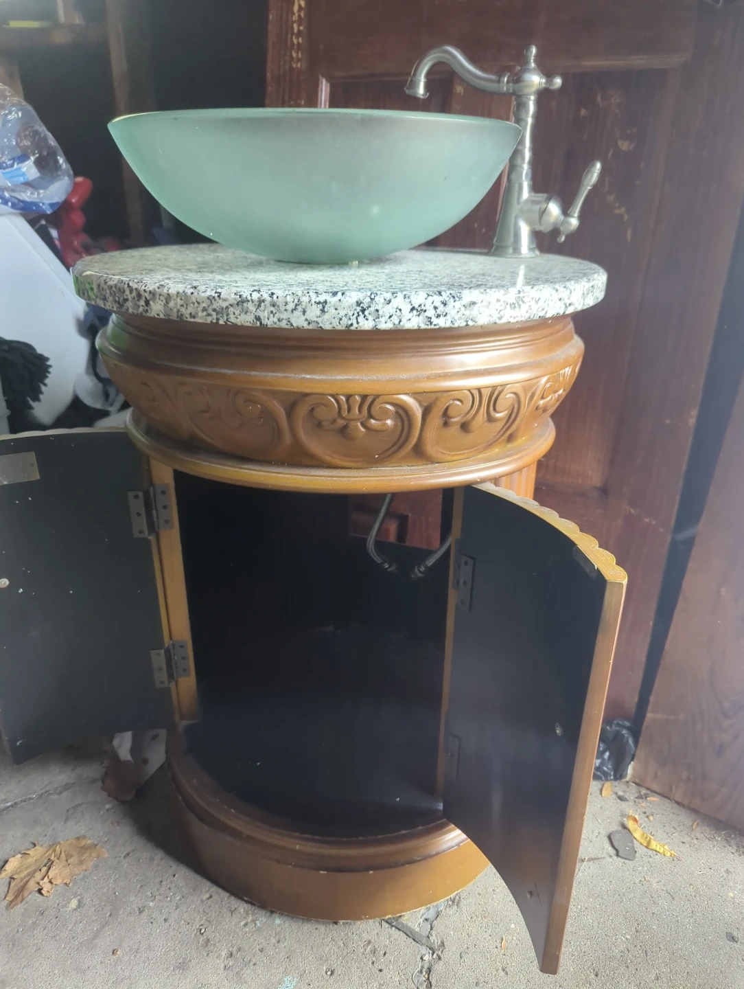 Selling a used bathroom vanity with a glass bowl sink. The vanity features a wooden cabinet with a granite top. The sink is a stylish glass bowl. Perfect for a small bathroom or powder room!