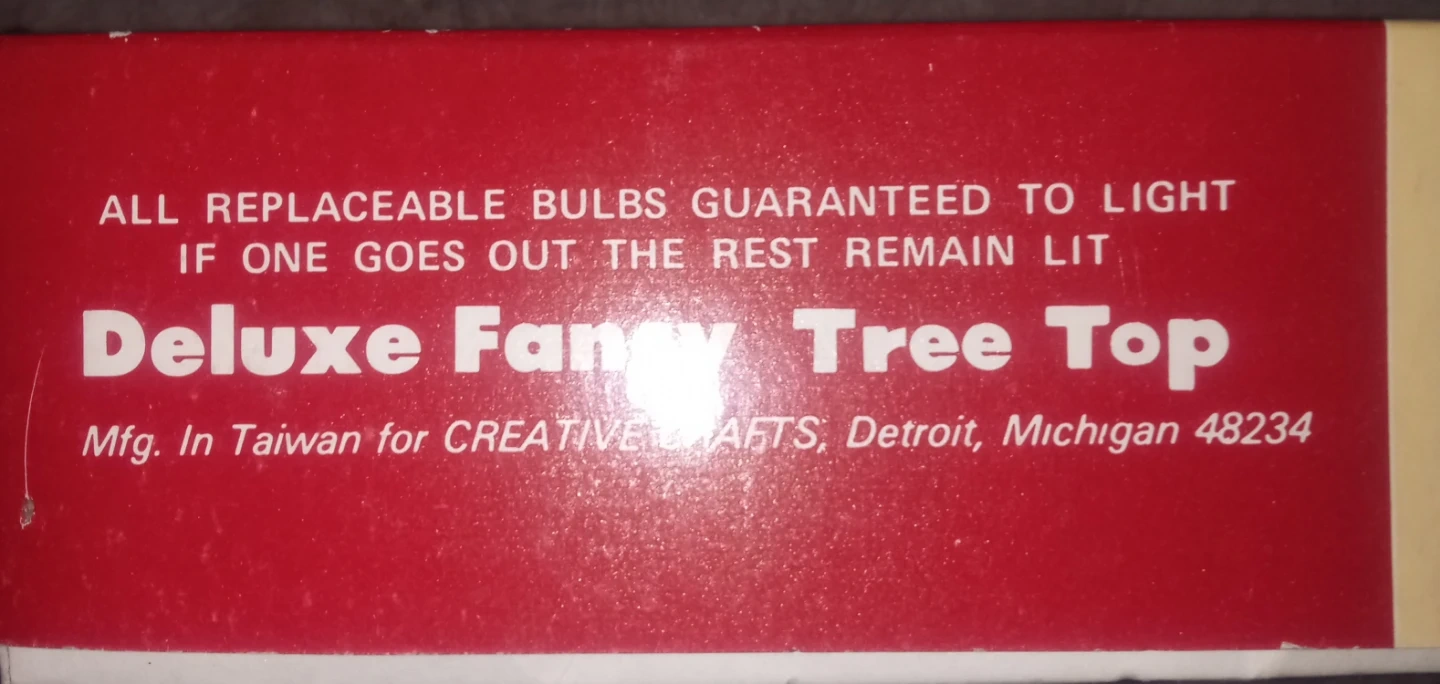 This is a Designers Deluxe Fancy Tree Top for your Christmas tree. All replaceable bulbs are guaranteed to light, and if one goes out, the rest remain lit. It's made in Taiwan for Creative Crafts, Detroit, Michigan.