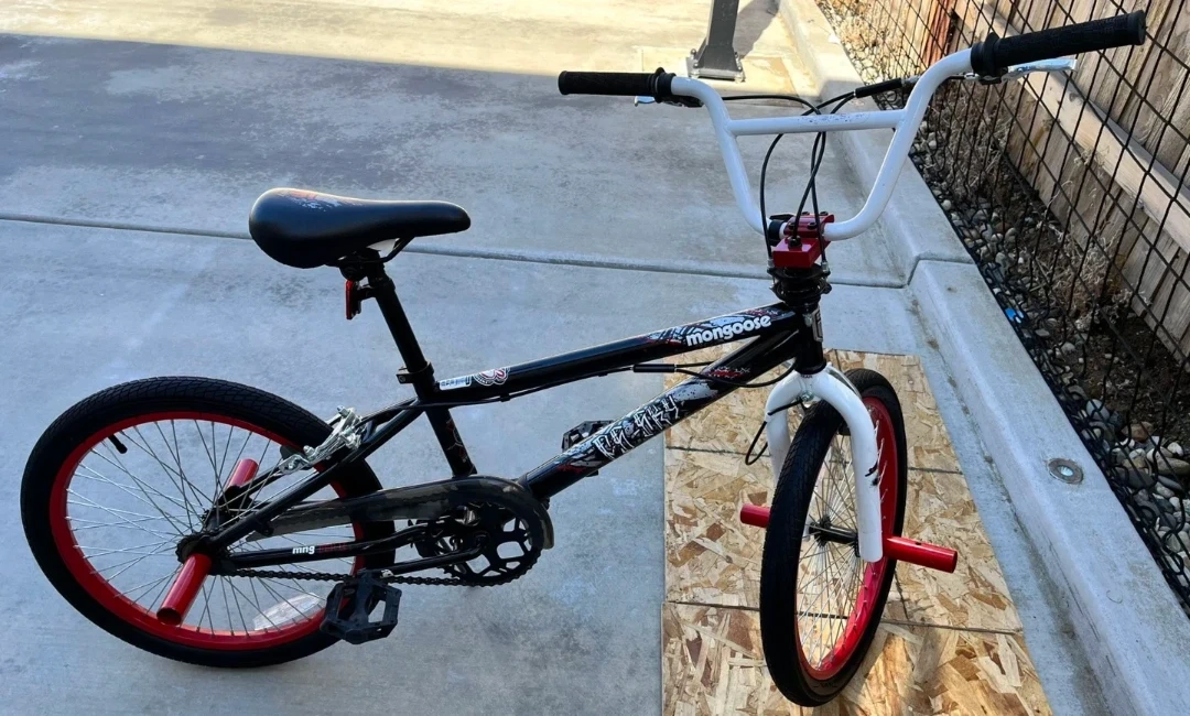 Selling a Mongoose BMX bike! It's a great bike for tricks or just riding around the neighborhood. It has a black frame with red accents on the tires. The bike is in good condition and ready to ride its a good bike and also it looks bigger that it is in the photo also those little red sticks sticking out the side of it on the wheels don't have them on it no more so I lowered the price