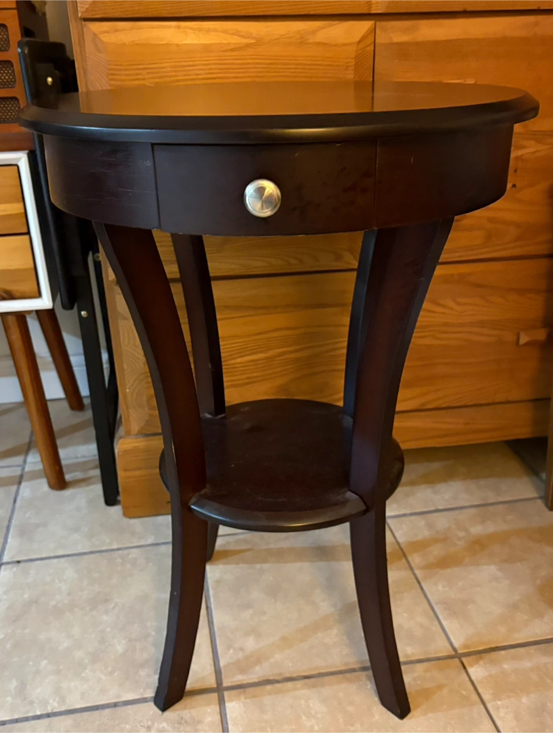 Dark wood round end table. Features a single drawer with a silver knob and a lower shelf. It's a great accent piece for any room!