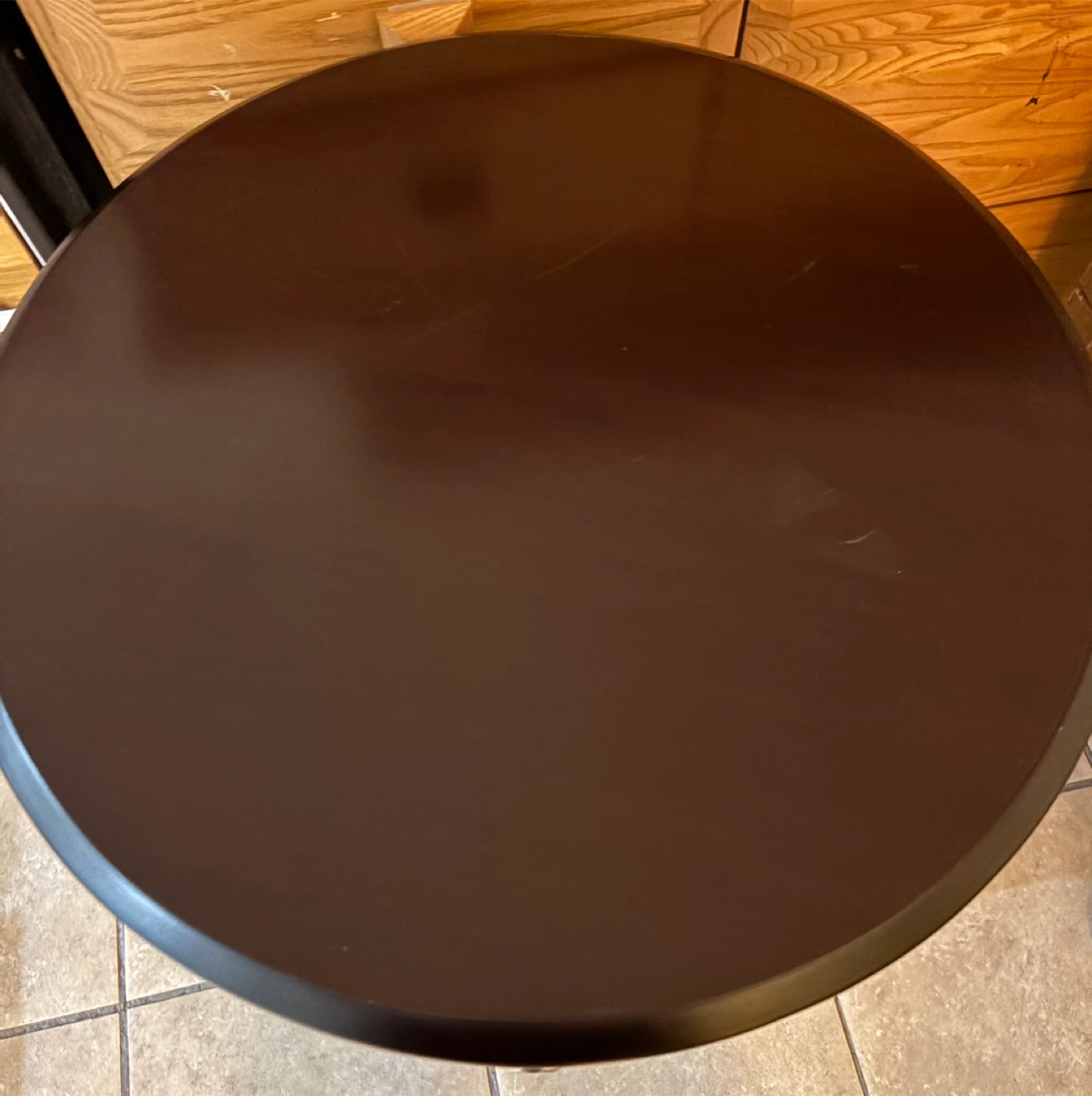 Dark wood round end table. Features a single drawer with a silver knob and a lower shelf. It's a great accent piece for any room!