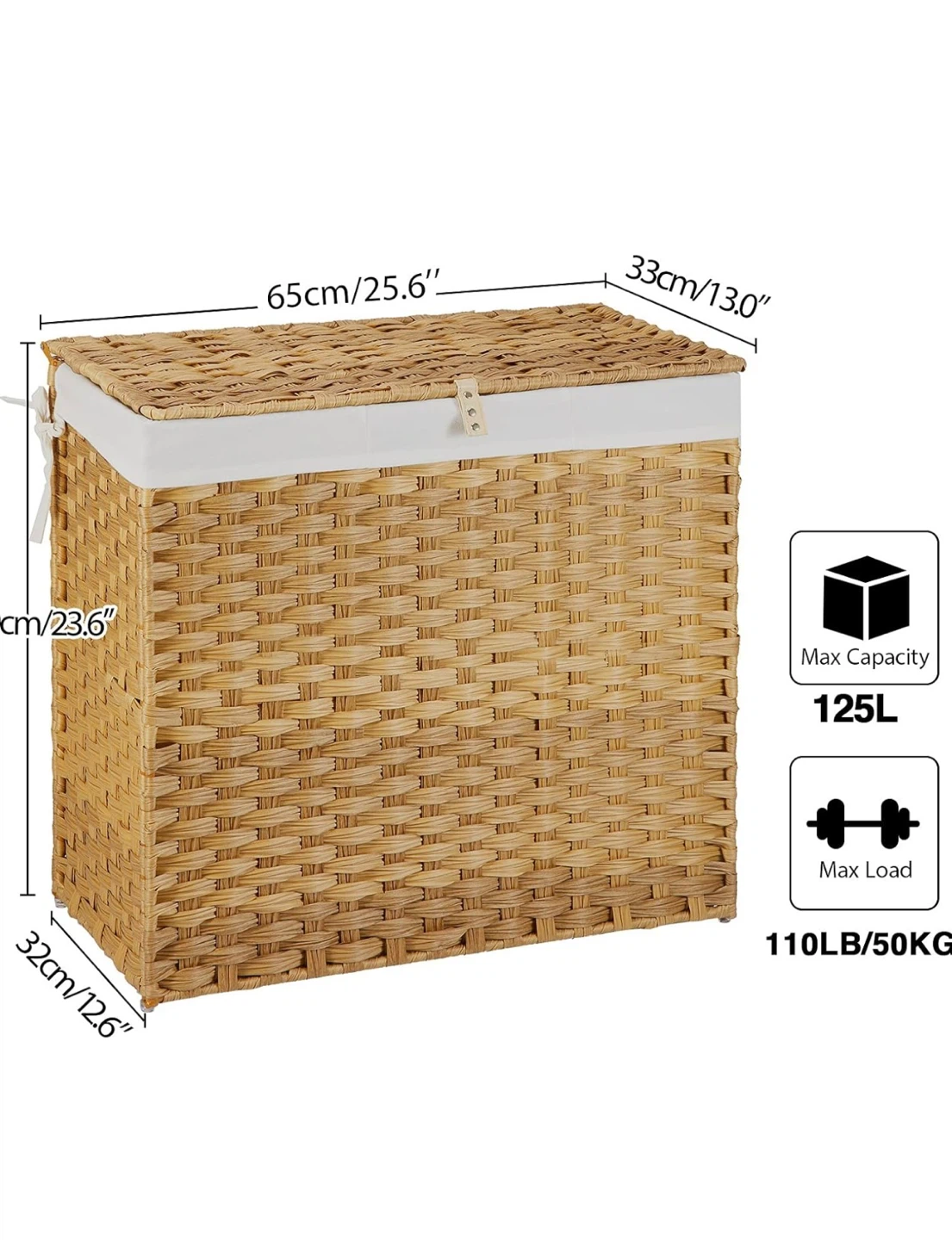 Wicker laundry hamper with a lid and a removable liner bag. It has a max capacity of 125L and a max load of 110LB/50KG. The dimensions are 65cm/25.6" x 33cm/13.0" x 60cm/23.6" x 32cm/12.6".
