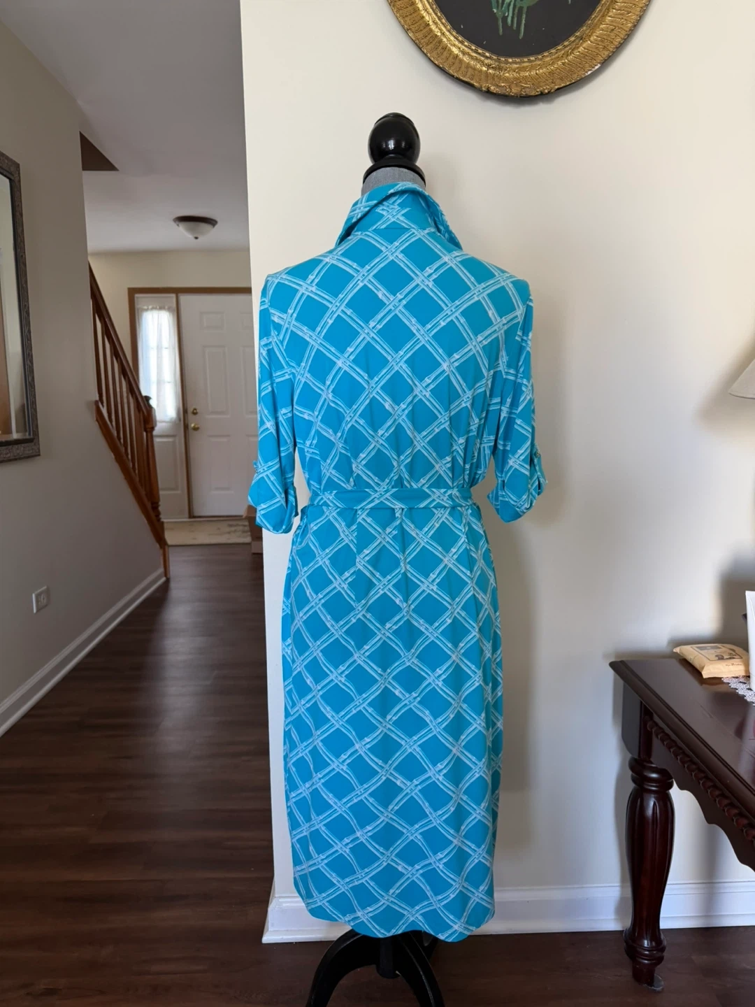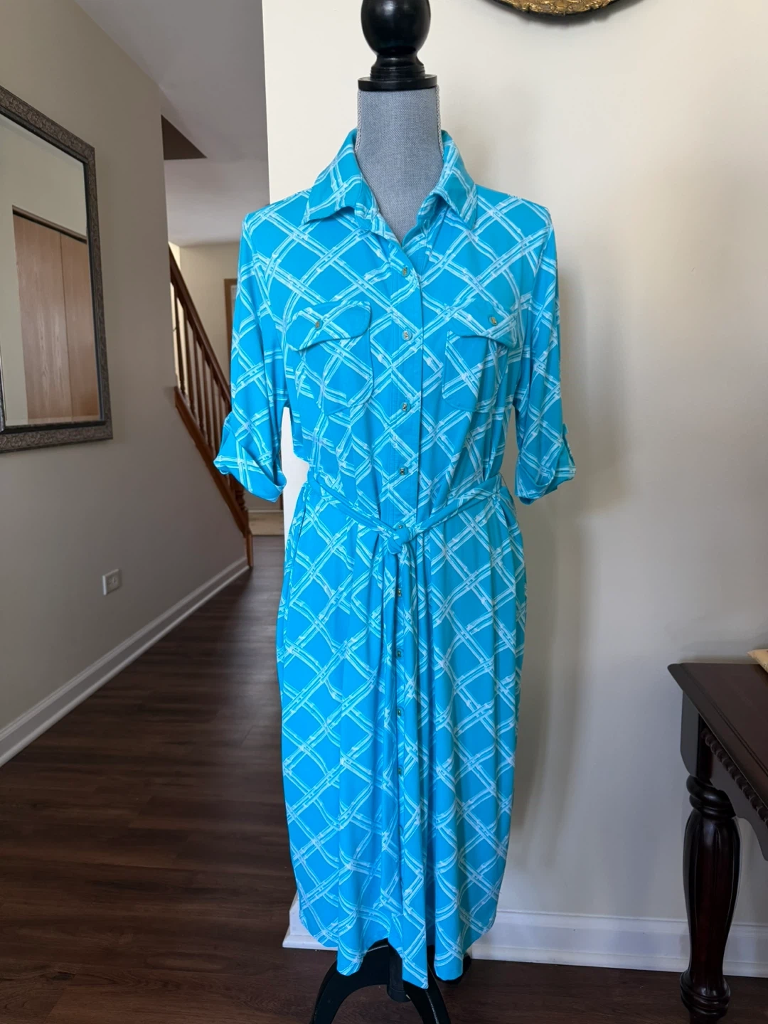 This Charter Club shirt dress comes in a vibrant blue with a white plaid pattern. It features a collared neckline, button-front closure, and a tie waist for a customizable fit. Made from a blend of 92% nylon and 8% spandex.
