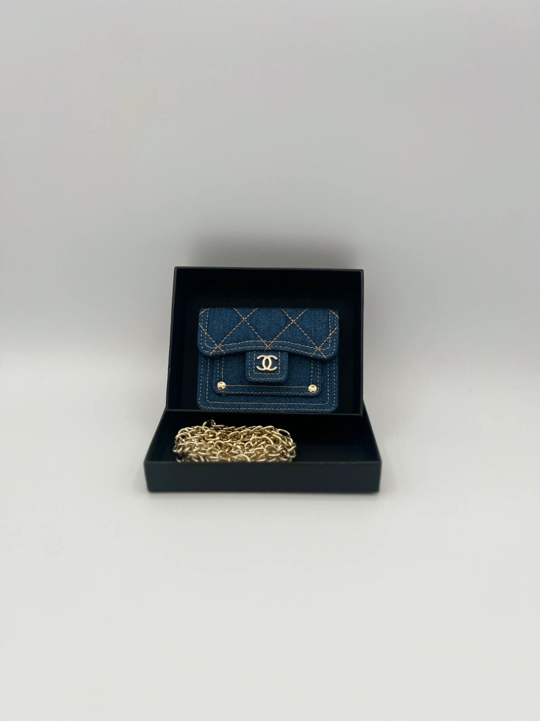 A stylish Chanel mini flap bag crafted from blue denim. It features the iconic interlocking CC logo and a gold-tone chain strap. This compact bag is perfect for essentials.