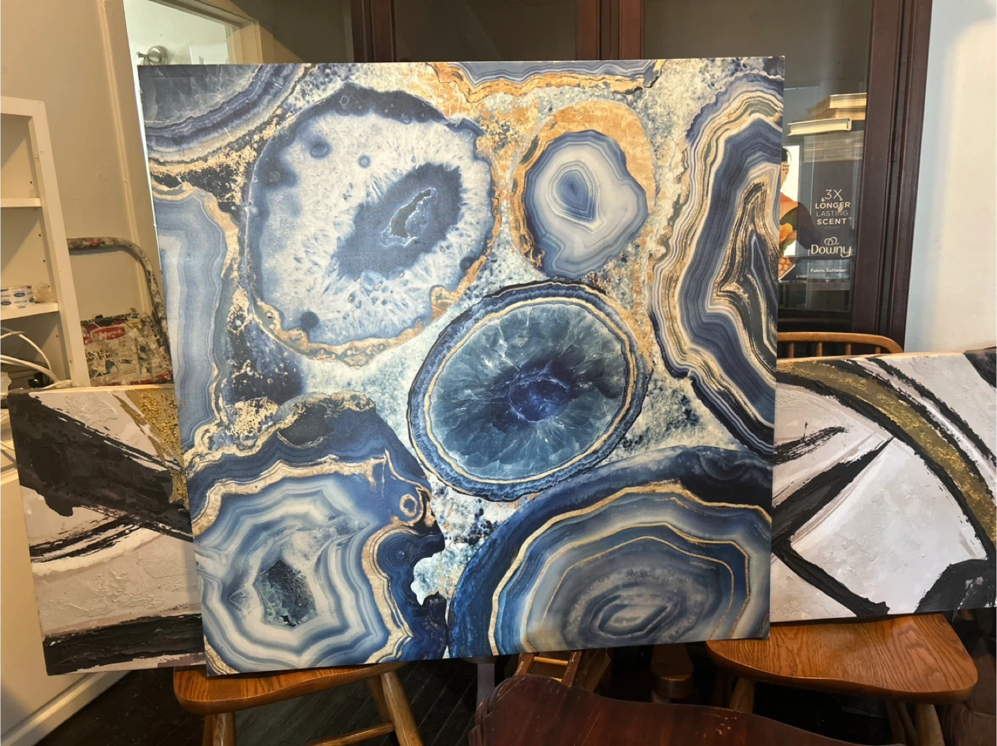 This is a beautiful piece of wall art featuring an agate-inspired design in shades of blue and gold. It would make a great addition to any room! Measures 39x39