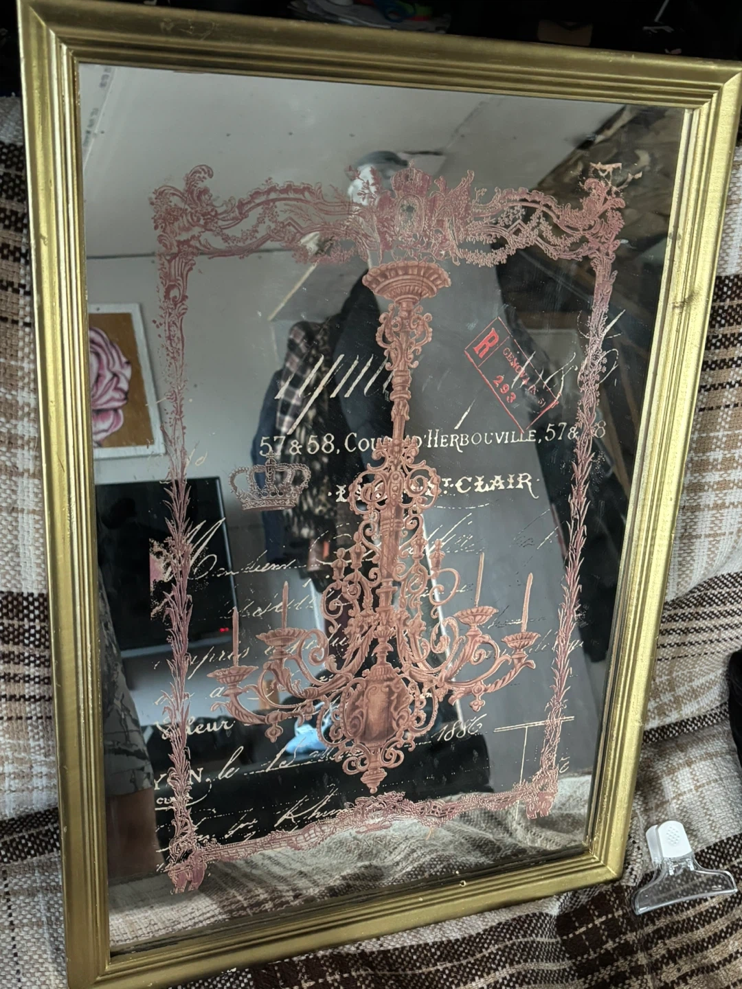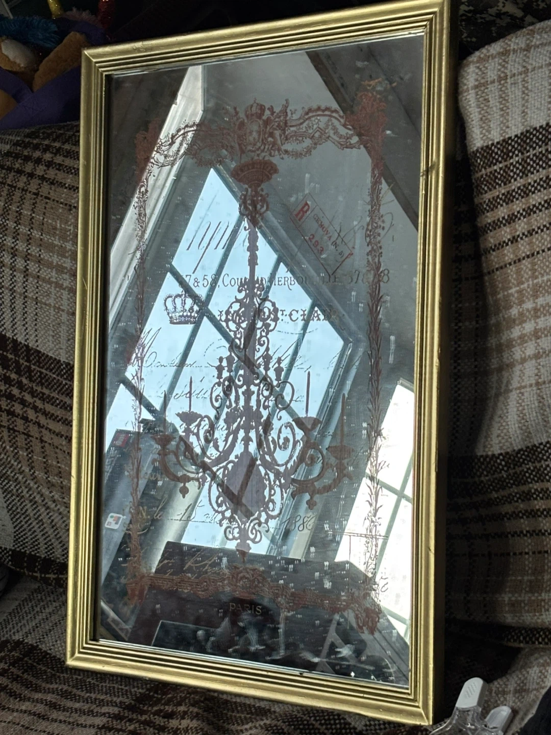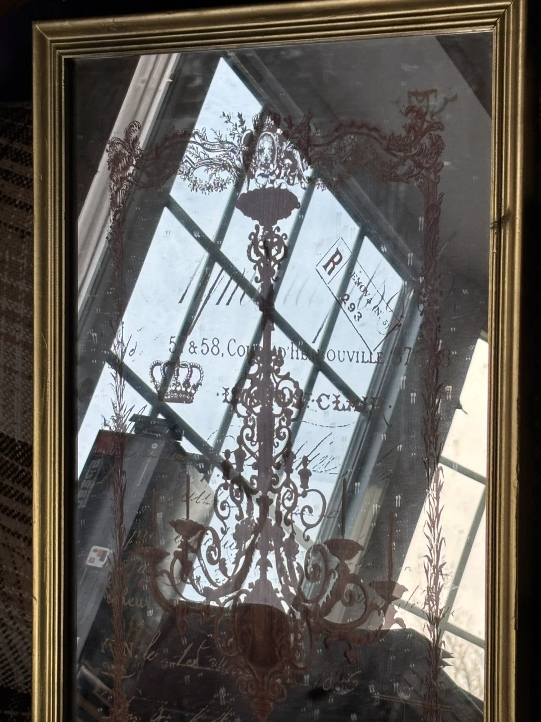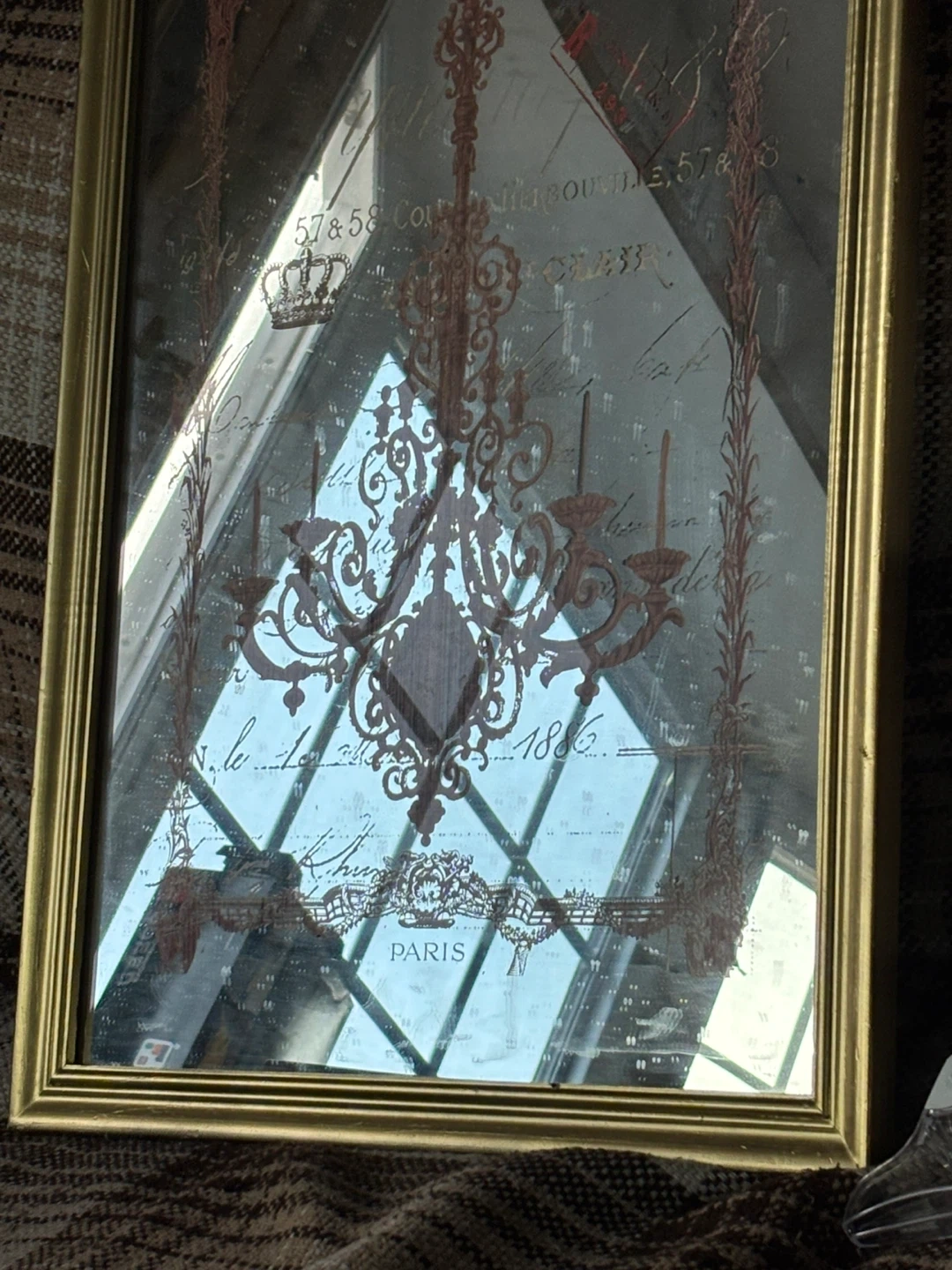 This decorative mirror features a unique design with a chandelier and French script. The frame has a gold finish. It's a charming piece for any room!