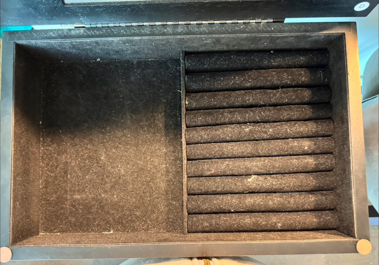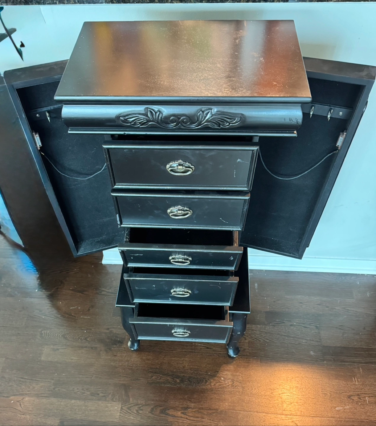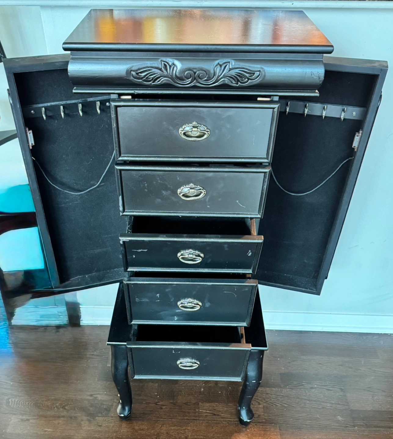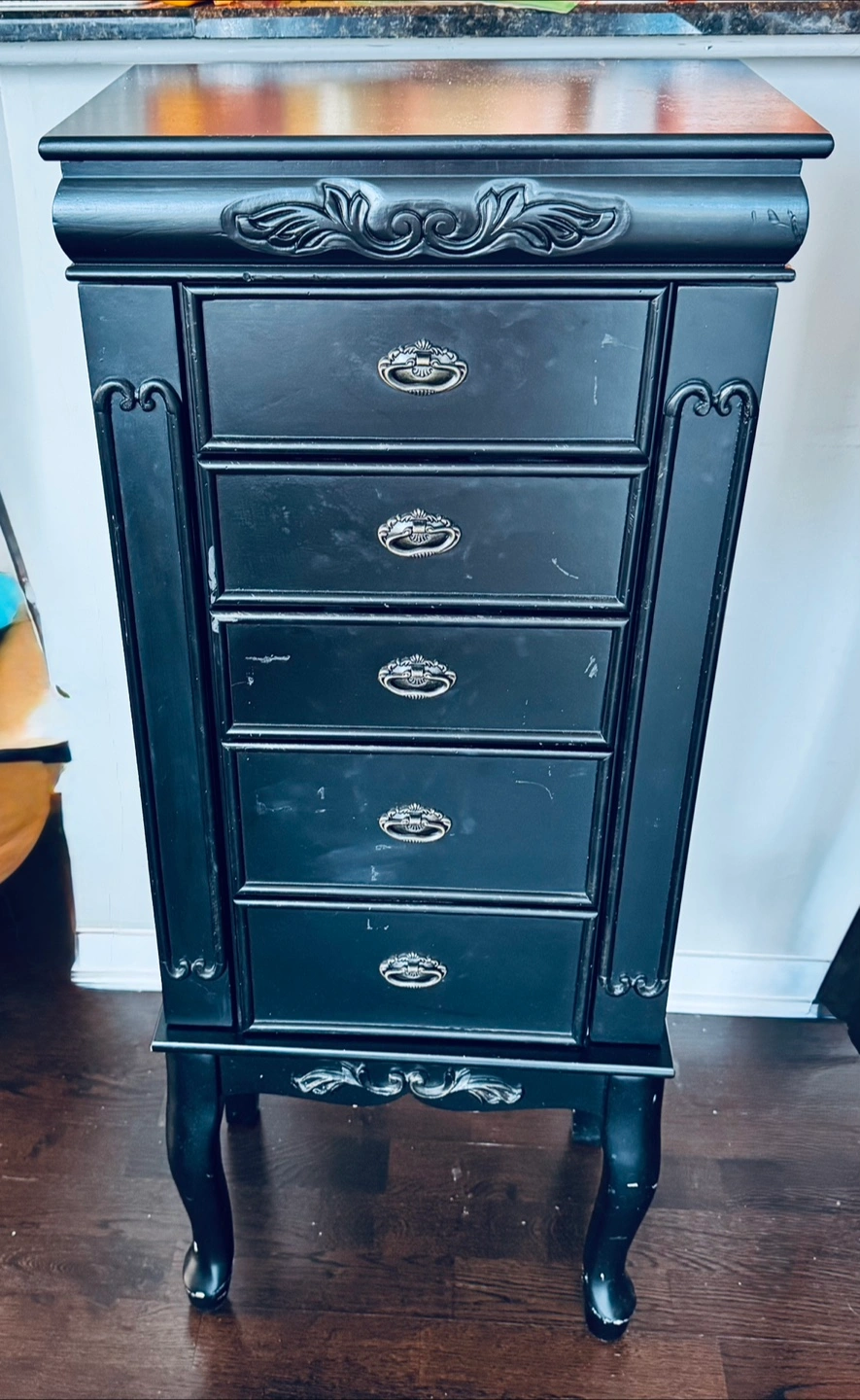 Selling a black jewelry armoire with cabinet storage. It has a classic design with five drawers and side compartments for hanging necklaces. It's perfect for organizing all your jewelry! It is missing the mirror from the top lid and has some marks/scratches on it.