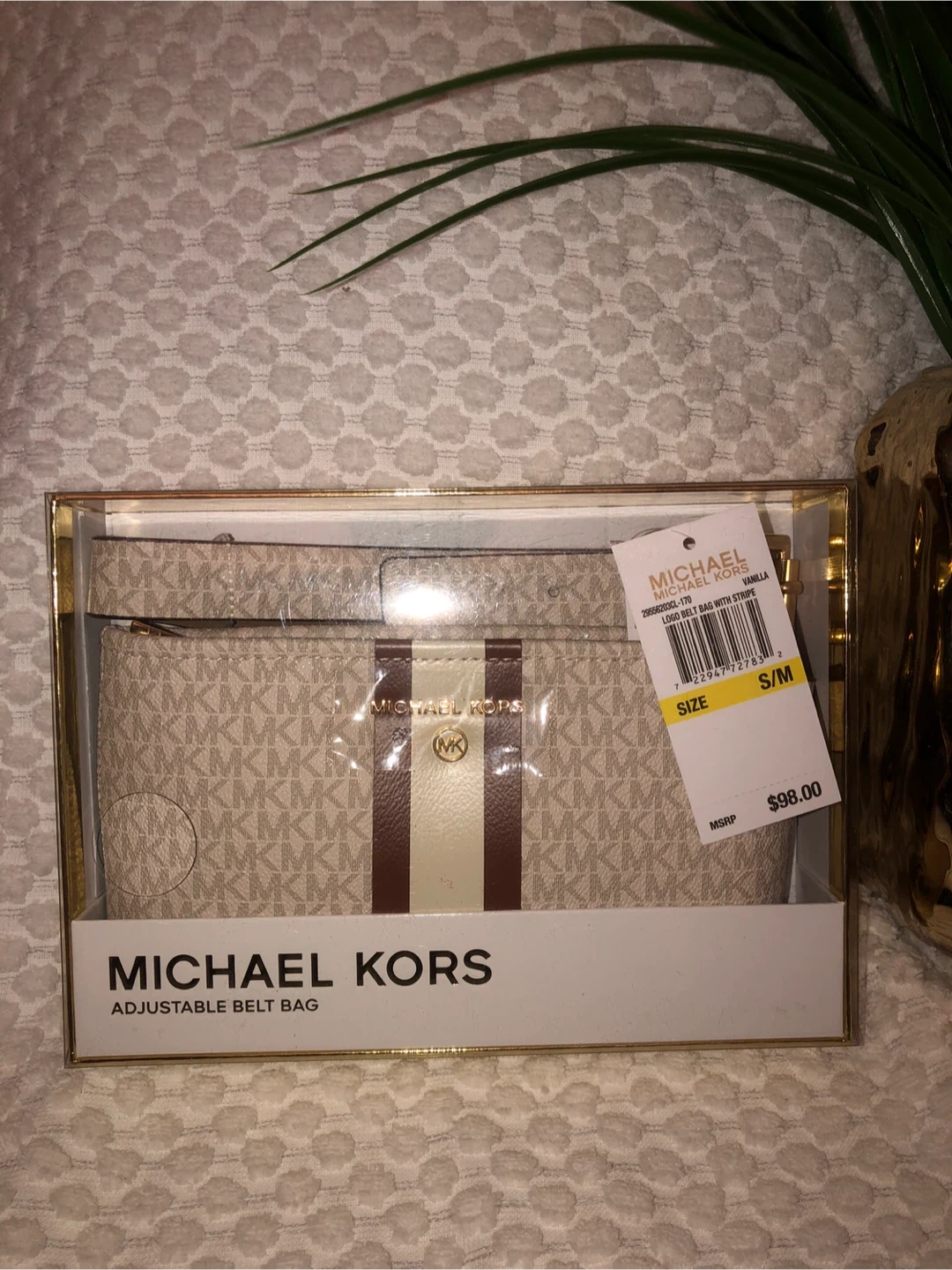 37This is a brand new Michael Kors adjustable belt bag! It features the logo design with a stripe. It's a size S/M and comes in the original box. Originally priced at $98