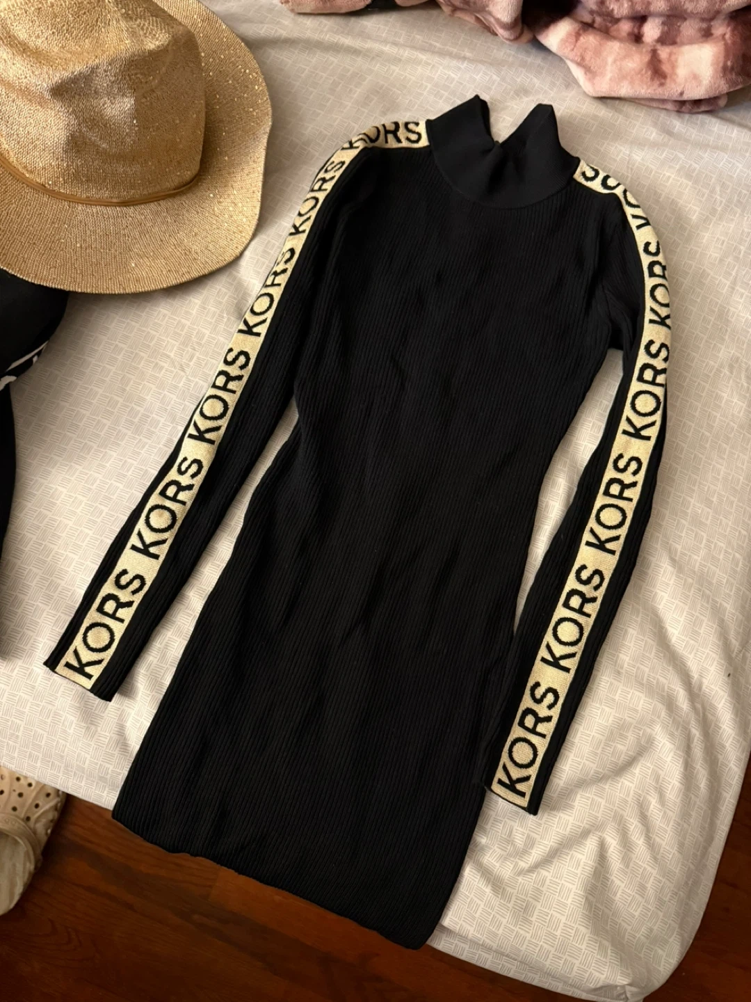 Selling a stylish Michael Kors black dress! It features a mock neck and the brand name is printed on both sleeves. It's in great condition and perfect for any occasion!